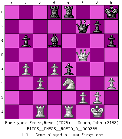 Last move : 1-0 2023 October 2 1:2:55 [Event "FICGS__CHESS__RAPID_A__000296"] [Site "FICGS"] [Date "2023.07.11"] [Round "1"] [White "Rodriguez Perez,Rene"] [Black "Dyson,John"] [Result "1-0"] [WhiteElo "2076"] [BlackElo "2153"] 1.e4 e5 2.Nf3 Nc6 3.Bc4 Bc5 4.O-O Nf6 5.d3 d6 6.c3 O-O 7.h3 a5 8.Nbd2 Be6 9.b3 d5 10.exd5 Bxd5 11.Qc2 Re8 12.Re1 h6 13.Bb2 Qc8 14.Rad1 Qf5 15.Bxd5 Nxd5 16.Ne4 Bd6 17.Bc1 Rad8 18.a3 Qg6 19.b4 axb4 20.axb4 b5 21.Bd2 Be7 22.Ra1 Nb6 23.Be3 Nd5 24.Bd2 Bf8 25.Rac1 f5 26.Ng3 Qf6 27.Qa2 Kh8 28.Qb1 Nb6 29.Be3 Bd6 30.Bc5 Qf7 31.Bxb6 cxb6 32.Qc2 Rd7 33.Qe2 Red8 34.Nf1 Rc8 35.Ne3 Re8 36.d4 e4 37.Nh4 Ne7 38.Qxb5 R7d8 39.Nhxf5 Nxf5 40.Qxf5 1-0 Follow this game move after move (download)Checkers is for tramps. (Paul Morphy) Um sich vor der Gefahr einer Erkältung zu schützen, sorge der wanderlustige König beizeiten für ein brauchbares Versteck. (Aaron Nimzowitsch) El ganador de una partida es aquel jugador que hace el penúltimo error. (Savielly Tartakover) L'ordinateur a tué l'originalité. Il n'y a plus guère d'aventures sur l'échiquier. (Jacob Murray) Opportunities multiply as they are seized. (Sun Tzu)