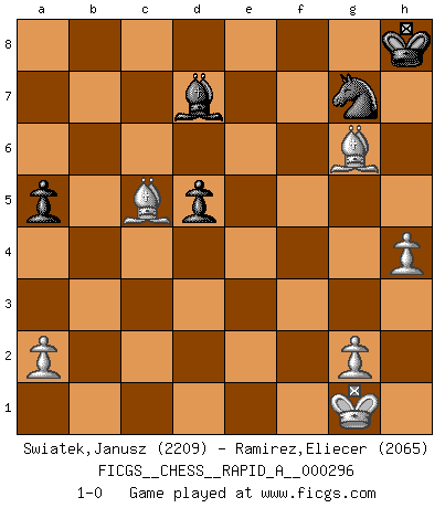 Last move : 1-0 2023 November 1 0:29:54 [Event "FICGS__CHESS__RAPID_A__000296"] [Site "FICGS"] [Date "2023.07.11"] [Round "1"] [White "Swiatek,Janusz"] [Black "Ramirez,Eliecer"] [Result "1-0"] [WhiteElo "2209"] [BlackElo "2065"] 1.e4 e5 2.Nf3 Nc6 3.Bb5 Nf6 4.O-O Nxe4 5.Re1 Nd6 6.Nxe5 Be7 7.Bf1 Nxe5 8.Rxe5 O-O 9.d4 Bf6 10.Re1 Re8 11.Bf4 Rxe1 12.Qxe1 Ne8 13.Nc3 Bxd4 14.Nd5 d6 15.Bg5 f6 16.Bh4 Bxb2 17.Rb1 Be5 18.f4 Bd4+ 19.Kh1 c6 20.Ne7+ Kh8 21.Bd3 d5 22.Qe2 g6 23.Nxg6+ hxg6 24.Bxg6 Ng7 25.Qd3 c5 26.c3 Qd6 27.Qf3 Bxc3 28.Qxc3 Qxf4 29.Qxf6 Qxf6 30.Bxf6 Bd7 31.h4 Rf8 32.Be7 Rb8 33.Bd6 Rd8 34.Rxb7 Be8 35.Be7 Rd7 36.Rxd7 Bxd7 37.Bxc5 a5 38.Kg1 1-0 Follow this game move after move (download)All my games are real. (Bobby Fischer) Die Leute spielen gegen mich seit 15 Jahren unter Ihren Möglichkeiten. (Robert James Fischer) Fischer es el jugador mas fuerte del mundo. De hecho, el jugador mas fuerte que jamas haya existido. (Larry Evans) On entre au jeu d'Echecs comme on entre en Religion. Pour le joueur d'Echecs, la partie d'Echecs c'est l'office, la messe, le défilé du 1er Mai, le dépôt de gerbe au Monument aux Morts. C'est un drame sacré. (Michel Roos) The leaves of memory seemed to make a mournful rustling in the dark. (Henry Wadsworth Longfellow)