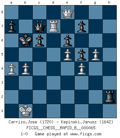 Last move : 1-0 2008 January 18 18:20:48 [Event "FICGS__CHESS__RAPID_B__000065"] [Site "FICGS"] [Date "2007.09.04"] [Round "1"] [White "Carrizo,Jose"] [Black "Kepinski,Janusz"] [Result "1-0"] [WhiteElo "1720"] [BlackElo "1642"] 1.e4 e6 2.d4 d5 3.Nc3 Nf6 4.Bg5 dxe4 5.Nxe4 Be7 6.Bxf6 gxf6 7.Nf3 b6 8.Bc4 Bb7 9.Qe2 Nd7 10.O-O-O c6 11.Rhe1 Qc7 12.Kb1 O-O-O 13.Ba6 Rhg8 14.g3 f5 15.Ned2 Nf6 16.Ne5 Bd6 17.c3 Bxa6 18.Qxa6+ Kb8 19.f4 Ng4 20.Qe2 h5 21.Ndc4 Bf8 22.Nf3 Bg7 23.Nce5 Rd5 24.Ka1 Rgd8 25.Ng5 Rf8 26.c4 Rd6 27.h3 Nxe5 28.dxe5 Rxd1+ 29.Rxd1 Rh8 30.c5 bxc5 31.Kb1 h4 32.gxh4 Rxh4 33.Qf2 Rh8 34.Qxc5 Bh6 35.h4 Bxg5 36.hxg5 Rh2 37.Qf8+ Kb7 38.a3 Qb6 39.b4 Ka6 40.a4 Qb7 41.Qd6 Qb6 42.Qd3+ Kb7 43.Qd7+ Qc7 44.Qe8 Ka6 45.Rd6 Kb6 46.Rd7 1-0 French : Burn variation Queenside Castling by player White (move 10) Queenside Castling by player Black (move 12) Player White won this chess game. Follow this game move after move (download)My style is somewhere between that of Tal and Petrosian. (Reshevsky) Charakterschwächen offenbaren sich normalerweise während einer Schachpartie. (Garry Kasparov) Las combinaciones han sido siempre el aspecto más intrigante del Ajedrez. Los Maestros las buscan, el público las aplauden, los críticos las alaban. La razón se debe a que las combinaciones hacen posible que el Ajedrez sea más que un ejercicio matemático con una carencia de vida. Ellas son la poesía del juego, son del Ajedrez lo que la melodía es de la música. Ellas representan el triunfo de la mente sobre la materia. (Reuben Fine) Shah mat. Le roi est mort. Cri de fierté d'un joueur venant de terrasser son adversaire, courtoisement, sans effusion de sang. The Internet isn't free. It just has an economy that makes no sense to capitalism. (Brad Shapcott)