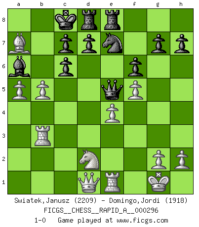 Last move : 1-0 2023 September 27 22:44:28 [Event "FICGS__CHESS__RAPID_A__000296"] [Site "FICGS"] [Date "2023.07.11"] [Round "1"] [White "Swiatek,Janusz"] [Black "Domingo,Jordi"] [Result "1-0"] [WhiteElo "2209"] [BlackElo "1918"] 1.e4 e5 2.Nf3 Nc6 3.Bb5 Bb4 4.c3 Ba5 5.a4 Bb6 6.Bxc6 bxc6 7.a5 Bc5 8.O-O Ba6 9.Re1 Qf6 10.b4 Bd6 11.d4 Ne7 12.Bg5 Qe6 13.dxe5 Bxe5 14.Nxe5 Qxe5 15.f4 Qd6 16.Nd2 Qd3 17.f5 Qxc3 18.Rb1 f6 19.Be3 O-O-O 20.Bxa7 Rhe8 21.Rb3 Qe5 22.b5 1-0 Follow this game move after move (download)We like to think. (Gary Kasparov) Wer wird heute Abend ihr Gegner sein? -- Heute Abend spiele ich gegen die schwarzen Steine. (Akiba Rubinstein) El Ajedrez es como la guerra en un tablero. (Bobby Fischer) Si le désir cupide (et stupide) de gagner est une inépuisable source de souffrance, une combinaison brillante sur l'échiquier est une découverte : le coquelicot qui s'épanouit lorsque apparaît la Voie Lactée. (Arrabal) Hold em is to stud what chess is to checkers. (Johnny Moss)