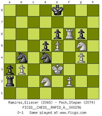 Last move : 0-1 2023 December 4 16:25:37 [Event "FICGS__CHESS__RAPID_A__000296"] [Site "FICGS"] [Date "2023.07.11"] [Round "1"] [White "Ramirez,Eliecer"] [Black "Pech,Stepan"] [Result "0-1"] [WhiteElo "2065"] [BlackElo "2074"] 1.e4 c5 2.c3 Nf6 3.e5 Nd5 4.Nf3 Nc6 5.Bc4 Nb6 6.Bb3 d5 7.d4 cxd4 8.cxd4 Bg4 9.Be3 e6 10.O-O Be7 11.h3 Bh5 12.Nbd2 Rc8 13.Rc1 Qd7 14.Bc2 O-O 15.Bb1 Nb4 16.b3 Rxc1 17.Qxc1 Rc8 18.Qb2 Bg6 19.Bxg6 hxg6 20.Ne1 Qb5 21.Ndf3 Qa6 22.a3 Nc6 23.a4 Nd7 24.Qc2 b5 25.Qe2 Rb8 26.Nc2 Rb6 27.axb5 Qxb5 28.Qxb5 Rxb5 29.Nd2 Ndb8 30.Rc1 Na6 31.Ne1 Nab8 32.Kf1 Bb4 33.Nef3 Ra5 34.Nb1 Ra2 35.Bd2 Bxd2 36.Nbxd2 Kf8 37.Ke2 Ke8 38.g4 Kd7 39.h4 a5 40.Rh1 Na6 41.h5 gxh5 42.Rxh5 g6 43.Rh7 Ke8 44.Rh8+ Ke7 45.Rh7 Nab4 46.Ng5 a4 47.Rxf7+ Ke8 48.Rf6 Nxd4+ 49.Ke3 a3 0-1 Follow this game move after move (download)Not all artists are Chess players, but all Chess players are artists. (Marcel Duchamp) Alles was ich jemals tun will ist Schach spielen. (Robert James Fischer) Por esta medida (el intervalo entre Fischer y sus contemporaneos), yo le considero el mas grande campeón mundial. (Garry Kasparov) Aucun coup ne doit être joué sans but. (Pedro Damiano) It's not the will to win, but the will to prepare to win that makes the difference. (Bear Bryant)