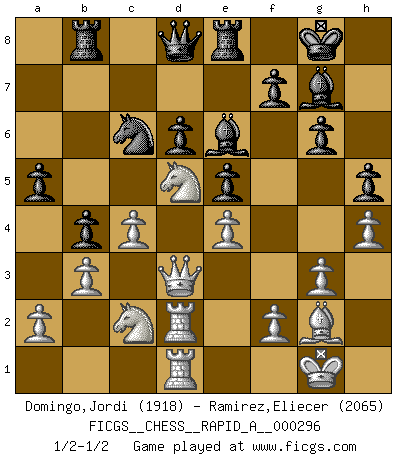 Last move : 1/2-1/2 2023 September 24 23:11:33 [Event "FICGS__CHESS__RAPID_A__000296"] [Site "FICGS"] [Date "2023.07.11"] [Round "1"] [White "Domingo,Jordi"] [Black "Ramirez,Eliecer"] [Result "1/2-1/2"] [WhiteElo "1918"] [BlackElo "2065"] 1.e4 c5 2.Nf3 Nc6 3.d4 cxd4 4.Nxd4 Nf6 5.Nc3 e5 6.Ndb5 d6 7.Bg5 a6 8.Na3 b5 9.Nd5 Be7 10.Bxf6 Bxf6 11.c4 b4 12.Nc2 O-O 13.g3 a5 14.Bg2 g6 15.O-O Bg7 16.Qd3 Rb8 17.b3 Be6 18.Rfd1 Re8 19.Rd2 h5 20.h4 Rb7 21.Rad1 Rb8 1/2-1/2 Follow this game move after move (download)What would Chess be without silly mistakes ? (Kurt Richter) Es hat in meinem Leben Zeiten gegeben, da ich sehr nahe daran war zu glauben, daß ich auch nicht eine einzige Schachpartie verlieren könnte. (José Raúl Capablanca) En posiciones complicadas, Bobby Fischer pocas veces tuvo que temer de cualquiera. (Paul Keres) A ce moment-là, je menaçais de comprendre la position ! (Clément L'Heureux) Wawaweewa ! (Borat: Cultural learnings of America for make benefit glorious nation of Kazakhstan)