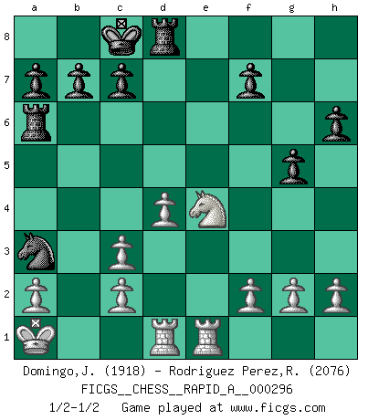Last move : 1/2-1/2 2023 September 27 22:46:24 [Event "FICGS__CHESS__RAPID_A__000296"] [Site "FICGS"] [Date "2023.07.11"] [Round "1"] [White "Domingo,Jordi"] [Black "Rodriguez Perez,Rene"] [Result "1/2-1/2"] [WhiteElo "1918"] [BlackElo "2076"] 1.e4 e6 2.d4 d5 3.Nc3 Nf6 4.Bg5 h6 5.Bxf6 Qxf6 6.exd5 Bb4 7.Bb5+ Bd7 8.Bxd7+ Nxd7 9.dxe6 Bxc3+ 10.bxc3 Qxe6+ 11.Qe2 Qxe2+ 12.Nxe2 O-O-O 13.O-O-O Nb6 14.Rhe1 Rd5 15.Nf4 Ra5 16.Kb2 Nc4+ 17.Ka1 g5 18.Nh5 Rd8 19.Nf6 Na3 20.Kb2 Nc4+ 21.Ka1 Ra6 22.Ne4 Na3 23.Kb2 Nc4+ 24.Ka1 Na3 25.Kb2 Nc4+ 26.Ka1 Na3 1/2-1/2 Follow this game move after move (download)A chess genius has died; a loss for humanity. (Viktor Kortchnoi, about Bobby Fischer's death) Ich bin der einzige Schachspieler, der sich während der Vorbereitungen zum Turnier verletzt hat. (Woody Allen) El Ajedrez es el juego mas altamente simbólico, pero las agresiones estan por lo tanto aún mas francamente representadas en la partida. Tal vez comenzo como un juego de guerra; Algo como la representación de una batalla en miniatura entre las fuerzas de dos reinos. (Karl Meninger) L'attaque fait le spectacle, la défense gagne les matchs. (Dicton footballistique) The next best thing to gambling and winning is gambling and loosing. (Nick Dandalos)