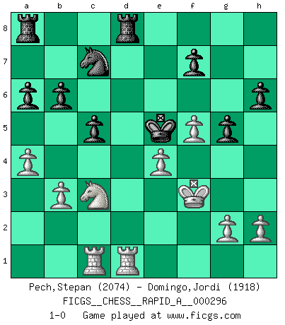 Last move : 1-0 2023 November 10 11:42:38 [Event "FICGS__CHESS__RAPID_A__000296"] [Site "FICGS"] [Date "2023.07.11"] [Round "1"] [White "Pech,Stepan"] [Black "Domingo,Jordi"] [Result "1-0"] [WhiteElo "2074"] [BlackElo "1918"] 1.c4 Nf6 2.Nc3 e6 3.d4 d5 4.Bg5 Be7 5.Nf3 h6 6.Bxf6 Bxf6 7.e3 O-O 8.Rc1 c6 9.Bd3 Nd7 10.O-O dxc4 11.Bxc4 e5 12.Ne4 exd4 13.Nxf6+ Nxf6 14.Nxd4 Qe7 15.Qb3 c5 16.Ne2 b6 17.Rfd1 Re8 18.a4 Be6 19.Bxe6 Qxe6 20.Qxe6 Rxe6 21.Nc3 R6e8 22.Kf1 Red8 23.Ke2 Kf8 24.f3 Ke7 25.e4 Ke6 26.Nb5 Ne8 27.b3 a6 28.Nc3 Nc7 29.f4 g5 30.f5+ Ke5 31.Kf3 1-0 This chess game has been lost on time (started : 2023.07.11 20:6:30) Follow this game move after move (download)I'm not afraid of Spassky. The world knows I'm the best. You don't need a match to prove it. (Bobby Fischer) Ich weiss nicht was Gott gegen mich auf 1.e4 antworten würde. (Robert James Fischer) El Ajedrez es despiadado: debes de estar preparado para matar gente. (Nigel Short) Assurément je connaissais par expérience le mystérieux attrait de ce jeu royal, le seul entre tous les jeux inventés par les hommes qui échappe souverainement à la tyrannie du hasard, le seul où l'on ne doive sa victoire qu'à son intelligence ou plutôt à une certaine forme d'intelligence. Mais n'est-ce pas déjà le limiter injurieusement que d'appeler les échecs un jeu ? N'est-ce pas une science, un art ou quelque chose qui, comme le cercueil de Mahomet entre ciel et terre, est suspendu entre l'un et l'autre, et qui réunit un nombre incroyable de contraires ? [...] C'est une pensée qui ne mène à rien, une mathématique qui n'établit rien, un art qui ne laisse pas d'uvre, une architecture sans matière; et il l'a prouvé néanmoins qu'il était plus durable, à sa manière, que les livres ou que tout autre monument, ce jeu unique qui appartient à tous les peuples et à tous les temps, et dont personne ne sait quel dieu en fit don à la terre pour tuer l'ennui, pour aiguiser l'esprit et stimuler l'âme. Où commence-t-il, où finit-il ? (Stefan Zweig) The Internet is the world's largest library. It's just that all the books are on the floor. (John Allen Paulos)