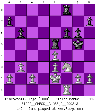 Last move : 1-0 2023 October 22 19:58:25 [Event "FICGS__CHESS__CLASS_C__000313"] [Site "FICGS"] [Date "2023.07.11"] [Round "1"] [White "Fioravanti,Diego"] [Black "Pintor,Manuel"] [Result "1-0"] [WhiteElo "1888"] [BlackElo "1738"] 1.e4 e5 2.Nc3 Bc5 3.Nf3 d6 4.d4 exd4 5.Nxd4 Qf6 6.Be3 Nc6 7.Nd5 Qd8 8.Nb5 Bxe3 9.Ndxc7+ Kf8 10.fxe3 Rb8 11.Qxd6+ Qxd6 12.Nxd6 Bd7 13.Bc4 Ne5 14.Nd5 Bg4 15.Be2 Bxe2 16.Kxe2 Ne7 17.Rad1 b6 18.Nxe7 Kxe7 19.Nf5+ Kf6 20.Rd6+ Kg5 21.Rf1 g6 22.Rd5 f6 23.Nd4 Rbe8 24.b3 Rhf8 25.Rxe5+ Rxe5 26.Nf3+ 1-0 Follow this game move after move (download)Only the player with the initiative has the right to attack. (Wilhelm Steinitz) Es ist im Leben wie im Schachspiel. Wir entwerfen einen Plan, dieser bleibt jedoch bedingt durch das, was im Schachspiel dem Gegner, im Leben dem Schicksal zu tun belieben wird. (Arthur Schopenhauer) No volvere nunca a jugar contigo. Has insultado a mi amigo. - cuando un oponente se maldijo por una mala jugada (Miguel Najdorf) Les Echecs ont trois composantes : le temps, l'espace et le matériel en dernier. (Mikhail Tal) I've never seen so many men wasted so badly. (Blondie in The Good, The Bad and The Ugly)