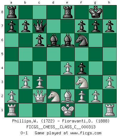 Last move : 0-1 2023 September 8 15:40:54 [Event "FICGS__CHESS__CLASS_C__000313"] [Site "FICGS"] [Date "2023.07.11"] [Round "1"] [White "Phillips,Wendell"] [Black "Fioravanti,Diego"] [Result "0-1"] [WhiteElo "1722"] [BlackElo "1888"] 1.d3 e5 2.e4 Nc6 3.c3 d5 4.Nd2 Nf6 5.Be2 Be6 6.h3 Bd6 7.Qc2 O-O 8.Nf1 dxe4 9.dxe4 Ne7 10.Nf3 Ng6 11.Ng3 c6 12.b3 Nf4 13.Bxf4 exf4 14.Nf1 Qc7 15.N1d2 Rfe8 0-1 Follow this game move after move (download)By this measure (on the gap between Fischer & his contemporaries), I consider him the greatest world champion. (Garry Kasparov) Mein Name ist Rustam Kamsky. Sie haben meinen Sohn belästigt. Bereiten Sie sich aufs Sterben vor. (Rustam Kamsky) Me gusta decir que Bobby Fischer fue el mejor jugador que jamás haya existido. Pero lo que hizo de Fischer un genio, fue su habilidad de mezclar una frescura y pragmatismo Americano con ideas Rusas acerca de la estrategia. (Bruce Pandolfini) Toute estimation doit être constamment réévaluée. (Jacob Estrin) The modern world has divided itself into Conservatives and Progressives. The business of Progressives is to go on making mistakes. The business of the Conservatives is to prevent the mistakes from being corrected. (G.K. Chesterton)