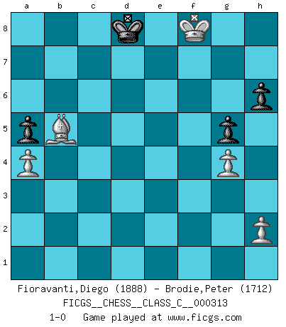 Last move : 1-0 2024 October 11 19:42:54 [Event "FICGS__CHESS__CLASS_C__000313"] [Site "FICGS"] [Date "2023.07.11"] [Round "1"] [White "Fioravanti,Diego"] [Black "Brodie,Peter"] [Result "1-0"] [WhiteElo "1888"] [BlackElo "1712"] 1.Nf3 Nf6 2.g3 Nc6 3.d4 d5 4.Bg2 e6 5.O-O Be7 6.e3 b6 7.Nbd2 O-O 8.c4 Bb7 9.b3 dxc4 10.Ne5 Nd5 11.Ndxc4 f6 12.Nxc6 Bxc6 13.e4 Nc3 14.Qd3 Nb5 15.Bb2 Qd7 16.Rfd1 Rad8 17.Rac1 e5 18.Nxe5 fxe5 19.Qc4+ Kh8 20.Qxc6 Qxc6 21.Rxc6 Rd6 22.Rxd6 cxd6 23.dxe5 dxe5 24.a4 Nd4 25.Bxd4 exd4 26.Rxd4 Bc5 27.Rd2 g6 28.Kf1 Kg7 29.f4 g5 30.f5 Rf6 31.Ke2 Rd6 32.Rd5 Rxd5 33.exd5 Kf7 34.Kd3 Kf6 35.g4 Ke5 36.Kc4 Kd6 37.Kb5 Kc7 38.Ka6 Kb8 39.a5 bxa5 40.Kb5 Bb6 41.f6 Bd4 42.f7 Bg7 43.Kc6 Kc8 44.Be4 h6 45.Bf5+ Kd8 46.d6 a4 47.bxa4 a5 48.Kd5 Bf8 49.Bd3 Kd7 50.Bb5+ Kd8 51.Ke6 Bg7 52.Kf5 Bf8 53.Kg6 Bxd6 54.Kg7 Be7 55.f8Q+ Bxf8+ 56.Kxf8 1-0 Follow this game move after move (download)Many Chess players were surprised when after the game, Fischer quietly explained: 'I had already analyzed this possibility' in a position which I thought was not possible to foresee from the opening. (Mikhail Tal) Ein Isolani verdüstert die Stimmung auf dem ganzen Schachbrett. (Savielly Grigorievitsch Tartakower) No hay un Gran Maestro de Ajedrez que sea normal; solo se diferencían ellos por la magnitud de su locura. (Viktor Korchnoi) Le jeu d'échecs est comme rejeté hors du temps. (Antoine de Saint-Exupéry) For to win one hundred victories in one hundred battles is not the acme of skill. To subdue the enemy without fighting is the acme of skill. (Sun Tzu)