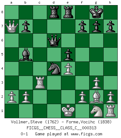 Last move : 0-1 2023 September 30 13:50:49 [Event "FICGS__CHESS__CLASS_C__000313"] [Site "FICGS"] [Date "2023.07.11"] [Round "1"] [White "Vollmer,Steve"] [Black "Forme,Vocihc"] [Result "0-1"] [WhiteElo "1762"] [BlackElo "1838"] 1.g3 d5 2.d4 c5 3.Bg2 cxd4 4.Qxd4 Nf6 5.Nc3 Nc6 6.Qd1 d4 7.Ne4 e5 8.c3 Be7 9.Bg5 O-O 10.Nxf6+ Bxf6 11.Bxf6 Qxf6 12.cxd4 Nxd4 13.e3 Re8 14.Rc1 Bf5 15.Qa4 Rad8 16.e4 Bd7 17.Qxa7 Bb5 18.Rc3 Qd6 0-1 Follow this game move after move (download)Whoever sees no other aim in the game than that of giving checkmate to one's opponent will never become a good Chess player. (Euwe) Die Leute spielen gegen mich seit 15 Jahren unter Ihren Möglichkeiten. (Robert James Fischer) Si el ingenio solamente fuese necesario para lucirse, las mujeres serían las mejores jugadoras de Ajedrez del mundo. (Albin) Que feriez-vous si vous étiez en train de jouer aux échecs et que la fin du monde arrive ? Je continuerais à jouer. (Saint Borromée) To steal ideas from one person is plagiarism. To steal from many is research. (Unknown)