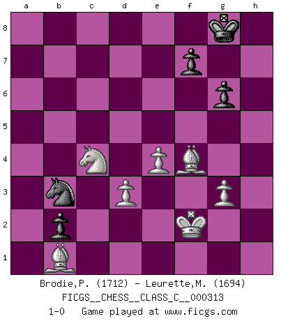 Last move : 1-0 2024 January 20 18:58:3 [Event "FICGS__CHESS__CLASS_C__000313"] [Site "FICGS"] [Date "2023.07.11"] [Round "1"] [White "Brodie,Peter"] [Black "Leurette,Marc-Antoine"] [Result "1-0"] [WhiteElo "1712"] [BlackElo "1694"] 1.e4 e5 2.Nf3 Nc6 3.Bb5 Nf6 4.Nc3 d6 5.d3 Bd7 6.O-O Be7 7.Bc4 O-O 8.Be3 a6 9.a3 Na5 10.Ba2 c6 11.b4 b6 12.bxa5 bxa5 13.Rb1 c5 14.Bd5 Rb8 15.Rxb8 Qxb8 16.Qb1 a4 17.Qxb8 Rxb8 18.Nd2 Bd8 19.Rb1 Rxb1+ 20.Ndxb1 Bb5 21.Nxb5 axb5 22.c4 b4 23.f4 Be7 24.axb4 cxb4 25.Bd2 b3 26.Bc6 exf4 27.Bxf4 a3 28.Nxa3 h6 29.h4 Ng4 30.Bd5 Bxh4 31.g3 Bd8 32.Bxd6 Bf6 33.c5 b2 34.c6 Bd8 35.c7 Bxc7 36.Bxc7 Ne3 37.Bb3 g6 38.Bf4 Ng4 39.Bd1 Nf6 40.Bxh6 Nd7 41.Bc2 Ne5 42.Bf4 Nf3+ 43.Kf2 Nd4 44.Bb1 Nb3 45.Nc4 1-0 Follow this game move after move (download)The blunders are all there on the board, waiting to be made. (Savielly Tartakover) Der zweitbeste Zug ist oft der einzig richtige. (Savielly Grigorievitsch Tartakower) El Ajedrez te enseña a controlarl la excitación inicial que sientes cuando vez algo que parece bueno y te enseña a pensar objetivamente cuando te encuentras en problemas. (Stanley Kubrick) Seul un grand joueur sait à quel point il joue faiblement. (Xavier Tartacover) Fortune favours the audacious. (Desiderius Erasmus)