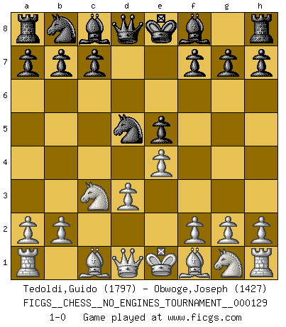 Last move : 1-0 2023 September 21 15:19:38 [Event "FICGS__CHESS__NO_ENGINES_TOURNAMENT__000129"] [Site "FICGS"] [Date "2023.07.15"] [Round "1"] [White "Tedoldi,Guido"] [Black "Obwoge,Joseph"] [Result "1-0"] [WhiteElo "1797"] [BlackElo "1427"] 1.c4 e5 2.Nc3 Nf6 3.d3 d5 4.cxd5 Nxd5 5.e4 1-0 This chess game has been lost on time (started : 2023.07.15 8:51:10) Follow this game move after move (download)Kasparov : J'adoube , Ivanchuk : S'il vous plaît ! (Garry Kasparov & Vassily Ivanchuk, Linares 1997) Ich brauche nur einen Blick auf das Schachbrett zu werfen, und weiß schon, was in der Stellung steckt, was geschehen kann und was geschehen wird. Alle übrigen suchen und prüfen, ich aber weiß es! (José Raúl Capablanca) En manos de Fischer's, una diminuta ventaja teórica es tan buena como tener una Reina de ventaja. (Isaac Kashdan) Dans le domaine de la peinture, de la gravure et de la sculpture, dès la première décennie de notre siècle, les artistes abandonnent la représentation de la partie d'échecs pour se concentrer sur les pièces, sur les échiquiers et sur toutes les variations auxquelles les unes et les autres peuvent donner lieu. On passe en quelque sorte d'un thème social à un thème musical (au sens de la musica médiévale, c'est-à -dire d'une notion qui inclue le rythme, l'harmonie, la construction et la déconstruction, etc.). Graphiquement et picturalement, l'échiquier apparaît comme une structure ouverte, dynamique, d'une richesse infinie, autorisant toutes les combinatoires et débouchant sur des mouvements et des rythmes de nature exponentielle. (Michel Pastoureau) Imagination is more important than knowledge. Knowledge is limited. Imagination encircles the world. (Albert Einstein)