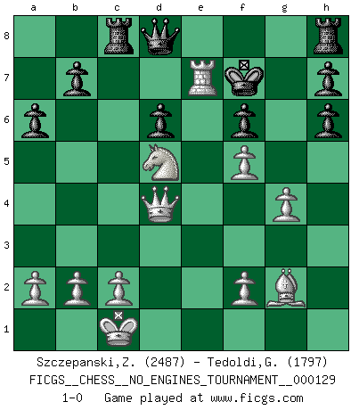 Last move : 1-0 2023 September 30 21:12:23 [Event "FICGS__CHESS__NO_ENGINES_TOURNAMENT__000129"] [Site "FICGS"] [Date "2023.07.15"] [Round "1"] [White "Szczepanski,Zbigniew"] [Black "Tedoldi,Guido"] [Result "1-0"] [WhiteElo "2487"] [BlackElo "1797"] 1.e4 c5 2.Nc3 d6 3.Nge2 Nc6 4.d4 cxd4 5.Nxd4 e5 6.Nf5 Bxf5 7.exf5 Be7 8.h4 a6 9.g4 Bxh4 10.Bg2 Be7 11.Qd3 Rb8 12.Be3 f6 13.O-O-O Rc8 14.Nd5 Nd4 15.Bxd4 exd4 16.Qxd4 Nh6 17.Rxh6 gxh6 18.Re1 Kf7 19.Rxe7+ 1-0 Follow this game move after move (download)All I want to do, ever, is just play Chess. (Bobby Fischer) Ich trinke, ich rauche, ich spiele, ich liebe Frauen aber Fernschach ist ein Laster, das ich nicht habe. (Mikhail Nekhemyevich Tal) El pensamiento metódico es mas útil en el Ajedrez que la inspiración. (C. J. S. Purdy) Toute estimation doit être constamment réévaluée. (Jacob Estrin) All the biggest technological inventions created by man - the airplane, the automobile, the computer - says little about his intelligence, but speaks volumes about his laziness. (Mark Kennedy)
