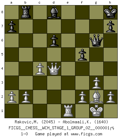 Last move : 1-0 2006 October 12 6:8:4 [Event "FICGS__CHESS__WCH_STAGE_1_GROUP_02__000001 "] [Site "FICGS"] [Date "2006.07.01"] [Round "1"] [White "Rakovic,Miroslav"] [Black "Abolmaali,Kayvan"] [Result "1-0"] [WhiteElo "2045"] [BlackElo "1640"] 1.c4 e5 2.g3 f5 3.Bg2 Nf6 4.Nc3 Nc6 5.d3 Bc5 6.e3 O-O 7.Nge2 d6 8.O-O Bd7 9.d4 exd4 10.exd4 Bb6 11.Bg5 Qe8 12.Bxf6 Rxf6 13.Nf4 Nxd4 14.Ncd5 Bc6 15.Nxf6+ gxf6 16.Nd5 Bxd5 17.Bxd5+ Kh8 18.Bxb7 Rb8 19.Bg2 c5 20.Re1 Qg6 21.Qd2 f4 22.Qxf4 f5 23.Rad1 Bd8 24.Rxd4 cxd4 25.Qxd4+ 1-0 This chess game has been lost on time (started : 2006.07.01 15:58:56) English Opening Kingside Castling by player Black (move 6) Kingside Castling by player White (move 8) Player White won this chess game. Follow this game move after move (download)I know people who have all the will in the world, but still can't play good Chess. (Bobby Fischer) Ich moechte nie einem Club beitreten, der Leute wie mich als Mitglieder aufnimmt. (Woody Allen) Cuando veas una buena jugada, trata de encontrar otra mejor. (Emanuel Lasker) Comme les marins qui ont mille raisons différentes d'aller en mer, les joueurs d'échecs en ont tout autant avant de s'installer devant une table et jouer... (Vincent Bertignac, philosophe) Don't be discouraged. It's often the last key in the bunch that opens the lock. (Author unknown)
