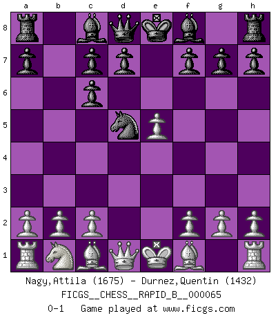Last move : 0-1 2007 October 12 12:28:59 [Event "FICGS__CHESS__RAPID_B__000065"] [Site "FICGS"] [Date "2007.09.04"] [Round "1"] [White "Nagy,Attila"] [Black "Durnez,Quentin"] [Result "0-1"] [WhiteElo "1675"] [BlackElo "1432"] 1.e4 e5 2.Nf3 Nc6 3.d4 exd4 4.Nxd4 Nf6 5.Nxc6 bxc6 6.e5 Nd5 0-1 This chess game has been lost on time (started : 2007.09.04 5:4:18) Scotch : Mieses variation Player Black won this chess game. Follow this game move after move (download)Chess is no whit inferior to the violin, and we have a large number of professional violinists. (Mikhail Botvinnik) Im Reiche der Wirklichkeit ist man nie so glücklich wie im Reiche der Gedanken. (Arthur Schopenhauer) Por tratar de evitar la pérdida de una pieza, muchas personas han perdido una partida de Ajedrez. (Savielly Tartakover) Votre seul travail dans les ouvertures est d'obtenir un milieu de partie jouable. (Lajos Portish) Those parts of the system that you can hit with a hammer (not advised) are called hardware; those program instructions that you can only curse at are called software. (Anonymous)
