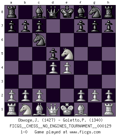 Last move : 1-0 2023 September 5 5:1:45 [Event "FICGS__CHESS__NO_ENGINES_TOURNAMENT__000129"] [Site "FICGS"] [Date "2023.07.15"] [Round "1"] [White "Obwoge,Joseph"] [Black "Goletto,Piero Giuseppe"] [Result "1-0"] [WhiteElo "1427"] [BlackElo "1340"] 1.e4 e5 2.Nf3 Nc6 3.d4 d5 4.Nxe5 1-0 This chess game has been lost on time (started : 2023.07.15 8:51:10) Follow this game move after move (download)The hardest game to win is a won game. (Emanuel Lasker) Mein Gehirn das ist mein zweitwichtigstes Organ [Aus dem Film: Der Schläfer]. (Woody Allen) Una clavada es mas poderosa que una espada. (Fred Reinfeld) Le succès, c'est être capable d'aller d'échec en échec sans perdre son enthousiasme. (Winston Churchill) Art disturbs, science reassures. (Georges Braque, Le Jour et la Nuit)