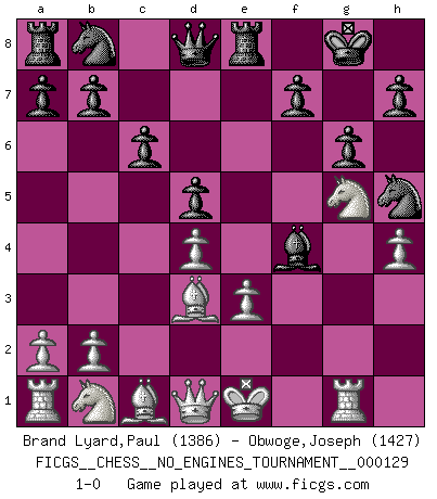 Last move : 1-0 2023 October 11 12:20:36 [Event "FICGS__CHESS__NO_ENGINES_TOURNAMENT__000129"] [Site "FICGS"] [Date "2023.07.15"] [Round "1"] [White "Brand Lyard,Paul"] [Black "Obwoge,Joseph"] [Result "1-0"] [WhiteElo "1386"] [BlackElo "1427"] 1.d4 d5 2.c4 e6 3.e3 Nf6 4.cxd5 exd5 5.Nf3 Bd6 6.Bb5+ c6 7.Bd3 O-O 8.Ng5 Bg4 9.f3 Bh5 10.g4 g6 11.gxh5 Nxh5 12.f4 Re8 13.Rg1 Bxf4 14.h4 1-0 This chess game has been lost on time (started : 2023.07.15 8:51:10) Follow this game move after move (download)Those who say they understand Chess, understand nothing. (Robert Hubner) Ich habe Kasparov in Rente geschickt. (Veselin Topalov) Vive, pierde y aprende al observar a tu oponente como gana. (Amber Steenbock) Aidez vos pièces, elles vous aideront. (Paul Morphy) A good programmer is someone who always looks both ways before crossing a one-way street. (Doug Linder)