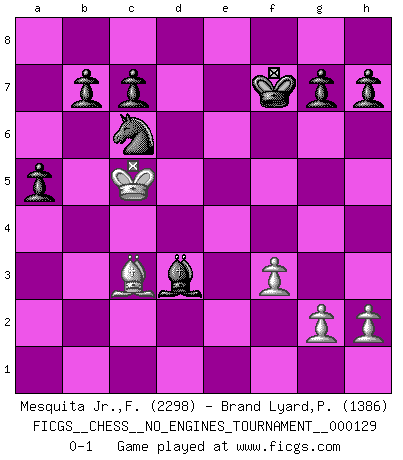 Last move : 0-1 2023 August 7 17:2:10 [Event "FICGS__CHESS__NO_ENGINES_TOURNAMENT__000129"] [Site "FICGS"] [Date "2023.07.15"] [Round "1"] [White "Mesquita Jr.,Fausto Monteiro"] [Black "Brand Lyard,Paul"] [Result "0-1"] [WhiteElo "2298"] [BlackElo "1386"] 1.d4 d5 2.c4 Nf6 3.cxd5 Qxd5 4.Nc3 Qd7 5.e4 e6 6.d5 Bb4 7.dxe6 Bxc3+ 8.bxc3 Qxd1+ 9.Kxd1 Nxe4 10.exf7+ Kxf7 11.Ke1 Nxc3 12.Bb2 Re8+ 13.Be2 Nxe2 14.Nxe2 Nc6 15.Rc1 Bg4 16.f3 Bh5 17.Kf2 Rad8 18.Rhe1 Rd2 19.Rb1 Bg6 20.Bc3 R8xe2+ 21.Rxe2 Rxe2+ 22.Kxe2 Bxb1 23.Ke3 Bxa2 24.Ke4 Bb1+ 25.Kd5 a5 26.Kc5 Bd3 0-1 Follow this game move after move (download)What is the object of playing a gambit opening?... To acquire a reputation of being a dashing player at the cost of losing a game. (Siegbert Tarrasch) Irgendwie scheint mir sonntags früh um 9 Uhr der Killerinstinkt verloren gegangen zu sein. (Alexej Shirov) Un jugador que es sorprendido, esta derrotado a medias. (Proverbio) Le jeu d'échecs est comme rejeté hors du temps. (Antoine de Saint-Exupéry) Now the reason the enlightened prince and the wise general conquer the enemy whenever they move and their achievements surpass those of ordinary men is foreknowledge. (Sun Tzu)