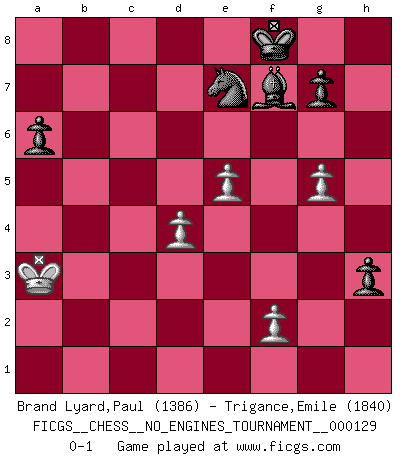 Last move : 0-1 2023 July 23 17:15:49 [Event "FICGS__CHESS__NO_ENGINES_TOURNAMENT__000129"] [Site "FICGS"] [Date "2023.07.15"] [Round "1"] [White "Brand Lyard,Paul"] [Black "Trigance,Emile"] [Result "0-1"] [WhiteElo "1386"] [BlackElo "1840"] 1.d4 e5 2.dxe5 d6 3.exd6 Nf6 4.dxc7 Qxc7 5.Nc3 Bb4 6.Bg5 Bxc3+ 7.bxc3 Qxc3+ 8.Qd2 Qxa1+ 9.Qd1 Qxd1+ 10.Kxd1 Ne4 11.Bh4 Nc3+ 12.Kd2 Nxa2 13.Nf3 O-O 14.e3 Nb4 15.Be7 N8c6 16.Bxf8 Kxf8 17.Bb5 a6 18.Bxc6 Nxc6 19.Ra1 b5 20.Ra3 Bb7 21.g4 Rd8+ 22.Kc3 b4+ 23.Kb3 bxa3 24.Kxa3 f6 25.h4 Ne7 26.Nd4 Bd5 27.g5 fxg5 28.hxg5 h5 29.e4 Bf7 30.c3 Rxd4 31.cxd4 h4 32.e5 h3 0-1 Follow this game move after move (download)Weak points or holes in the opponent's position must be occupied by pieces not Pawns. (Siegbert Tarrasch) Schach wird sich dank seiner hohen kulturellen Tradition immer durchsetzen. In näherer Zukunft womöglich sogar als Gegenreaktion auf die maßlose Reizüberflutung im Freizeit- und Spielbereich. (Garry Kasparov) El Ajedrez se juega con la mente... ¡no con las manos!. (Renaud y Kahn) La conception d'un plan est le processus par lequel un joueur exploite les avantages de sa position tout en s'efforçant d'en réduire au minimum les inconvénients. Afin de garantir le succès, un plan doit toujours se fonder sur un diagnostic objectif des particularités d'une position. La conception d'un plan est d'autant plus difficile que la position est équilibrée, et grandement facilitée lorsqu'il n'existe qu'un seul plan susceptible de répondre aux exigences de la position. (Harry Golombek) I don't diet. I just don't eat as much as I'd like to. (Linda Evangelista, supermodel)