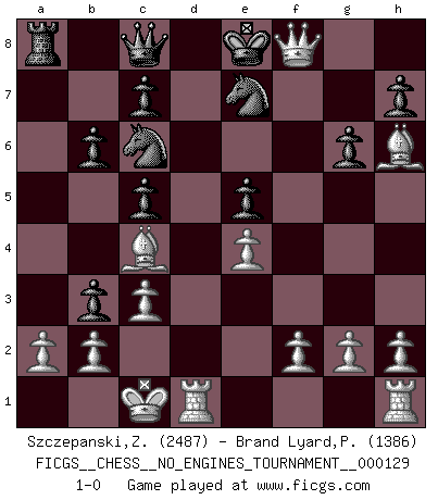 Last move : 1-0 2023 July 21 11:51:27 [Event "FICGS__CHESS__NO_ENGINES_TOURNAMENT__000129"] [Site "FICGS"] [Date "2023.07.15"] [Round "1"] [White "Szczepanski,Zbigniew"] [Black "Brand Lyard,Paul"] [Result "1-0"] [WhiteElo "2487"] [BlackElo "1386"] 1.e4 e5 2.Nf3 Nc6 3.Bc4 Bc5 4.c3 d6 5.d4 Bg4 6.dxc5 Bxf3 7.Qxf3 f6 8.Be3 dxc5 9.Nd2 Nge7 10.O-O-O b6 11.Nb3 Qc8 12.Qg3 g6 13.Qh4 a5 14.Qxf6 Rf8 15.Qg7 a4 16.Bh6 axb3 17.Qxf8+ 1-0 Follow this game move after move (download)I won't play with you anymore. You have insulted my friend. - When an opponent cursed himself for a blunder. (Miguel Najdorf) Warum muß ich gegen diesen IDIOTEN verlieren? (Aaron Nimzowitsch) La vida es como el Ajedrez, con lucha, competición y eventos buenos y malos. (Benjamin Franklin) Vous m'avez demandé de vous exposer quel est le fondement de la prière. Je ne fais que préparer les pièces du jeu sur la table... Nous sera-t-il permis d'en adopter les règles et si nous les appliquons scrupuleusement nous ne tarderons pas à faire mat le Roi divin ! Il ne pourra échapper à nos mains. (Sainte Thérèse d'Avila, Chemin de perfection) Think like a man of action, act like a man of thought. (Henri Louis Bergson)