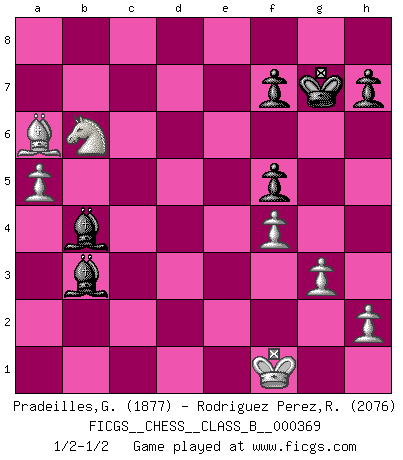 Last move : 1/2-1/2 2023 November 28 12:43:2 [Event "FICGS__CHESS__CLASS_B__000369"] [Site "FICGS"] [Date "2023.07.19"] [Round "1"] [White "Pradeilles,Guillaume"] [Black "Rodriguez Perez,Rene"] [Result "1/2-1/2"] [WhiteElo "1877"] [BlackElo "2076"] 1.e4 e6 2.d4 d5 3.Nc3 Nf6 4.Bg5 dxe4 5.Nxe4 Be7 6.Bxf6 gxf6 7.Qd2 f5 8.Nc3 a6 9.g3 Nd7 10.Bg2 Nb6 11.Nf3 c5 12.Rd1 cxd4 13.O-O Qc7 14.Nxd4 O-O 15.Qh6 Kh8 16.Rfe1 Rg8 17.a4 Nc4 18.Nxf5 exf5 19.Nd5 Qd6 20.Qxd6 Bxd6 21.b3 Nb2 22.Rd2 Be6 23.c3 Nxa4 24.bxa4 Rab8 25.Red1 Be5 26.c4 Rgd8 27.c5 Rbc8 28.f4 Bg7 29.Nb6 Rxd2 30.Rxd2 Bc3 31.Nxc8 Bxd2 32.Bxb7 Be3+ 33.Kg2 Bxc5 34.Bxa6 Bd5+ 35.Kf1 Kg7 36.a5 Bb4 37.Nb6 Bb3 1/2-1/2 Follow this game move after move (download)I believe that Chess possesses a magic that is also a help in advanced age. A rheumatic knee is forgotten during a game of Chess and other events can seem quite unimportant in comparison with a catastrophe on the chessboard. (Vlastimil Hort) Den Ruhm habe ich schon, jetzt brauche ich noch das Geld. (Wilhelm Steinitz) El Ajedrez es el gimnasio de la mente. (Blaise Pascal) Les échecs sont plus proches de l'art de l'assassinat que de l'art de la guerre. (Arturo Perez-Reverte) Whatever you do, don't be bored. This is absolutely the most exciting time we could have possibly hoped to be alive. And things are just starting. (From movie Waking life)