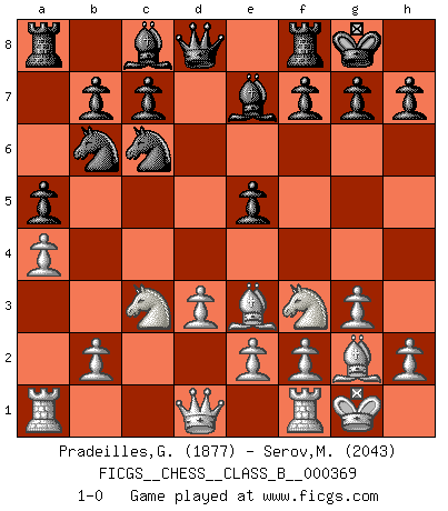 Last move : 1-0 2023 September 16 5:25:16 [Event "FICGS__CHESS__CLASS_B__000369"] [Site "FICGS"] [Date "2023.07.19"] [Round "1"] [White "Pradeilles,Guillaume"] [Black "Serov,Maksim"] [Result "1-0"] [WhiteElo "1877"] [BlackElo "2043"] 1.c4 e5 2.Nc3 Nf6 3.Nf3 Nc6 4.g3 d5 5.cxd5 Nxd5 6.Bg2 Nb6 7.O-O Be7 8.d3 O-O 9.a4 a5 10.Be3 1-0 This chess game has been lost on time (started : 2023.07.19 15:35:17) Follow this game move after move (download)Good positions don't win games, good moves do. (Gerald Abrahams) Ein guter Spieler hat immer Glück. (José Raúl Capablanca) El Ajedrez es la vida. (Bobby Fischer) Je crois qu'il existe des manières très spécifiques de jouer efficacement contre une machine. Evidemment, nous n'avons aucune chance en technique pure, parce que l'ordinateur calcule de manière parfaite. Mais lorsque nous faisons appel à notre cerveau, en utilisant l'intuition et la compréhension, alors nous restons beaucoup plus forts. (Anatoli Karpov) History is the quarrels of popes and kings, with wars or pestilences in every page; the men all so good for nothing, and hardly any women at all. (Jane Austen)