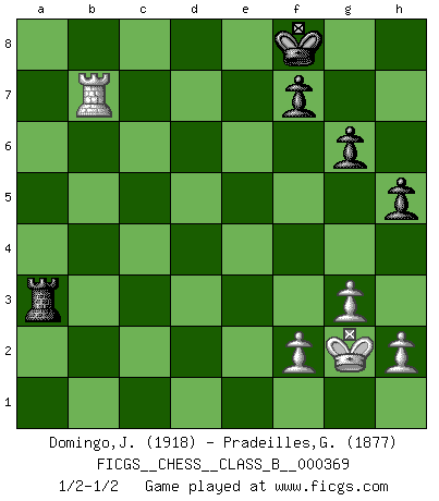 Last move : 1/2-1/2 2023 December 3 11:16:8 [Event "FICGS__CHESS__CLASS_B__000369"] [Site "FICGS"] [Date "2023.07.19"] [Round "1"] [White "Domingo,Jordi"] [Black "Pradeilles,Guillaume"] [Result "1/2-1/2"] [WhiteElo "1918"] [BlackElo "1877"] 1.e4 d5 2.exd5 Qxd5 3.Nc3 Qa5 4.d4 Nf6 5.Nf3 Bf5 6.Bc4 e6 7.Bd2 Bb4 8.a3 Bxc3 9.Bxc3 Qb6 10.d5 O-O 11.Bxf6 exd5 12.Bd4 c5 13.Bxd5 cxd4 14.O-O Rd8 15.Bc4 Nc6 16.Bd3 Bxd3 17.Qxd3 h6 18.b4 a5 19.b5 Ne7 20.Rad1 Nd5 21.Qxd4 Qxd4 22.Nxd4 Rac8 23.Nf5 Nc3 24.Rxd8+ Rxd8 25.b6 h5 26.g3 g6 27.Ne3 Rc8 28.Kg2 Rc6 29.Re1 Kf8 30.Nd1 Nxd1 31.Rxd1 Rxb6 32.Rd5 Rb2 33.Rxa5 Rxc2 34.Rb5 Ra2 35.Rxb7 Rxa3 1/2-1/2 Follow this game move after move (download)Life is a kind of Chess, with struggle, competition, good and ill events. (Benjamin Franklin) Im Hotelzimmer gab es nur zwei Schaben. (Über die Turnierbedingungen) (Peter Swidler) Entre mas años cumplo, mas valoro los Peones. (Keres) Ce n'est pas pour s'amuser qu'il joue aux échecs : il célèbre un culte. (Vladimir Nabokov) I don't believe in psychology. I believe in good moves. (Bobby Fischer)