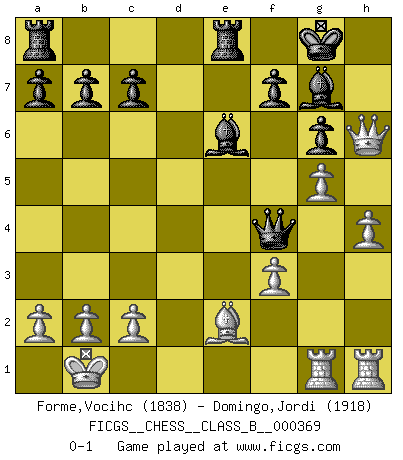 Last move : 0-1 2024 January 9 2:58:12 [Event "FICGS__CHESS__CLASS_B__000369"] [Site "FICGS"] [Date "2023.07.19"] [Round "1"] [White "Forme,Vocihc"] [Black "Domingo,Jordi"] [Result "0-1"] [WhiteElo "1838"] [BlackElo "1918"] 1.e4 e5 2.Nf3 d6 3.d4 exd4 4.Nxd4 Nf6 5.Nc3 Be7 6.Bf4 O-O 7.Be2 Re8 8.Qd2 Bf8 9.f3 Nc6 10.O-O-O Nxd4 11.Qxd4 Be6 12.g4 Nd7 13.h4 Ne5 14.Bxe5 dxe5 15.Qxe5 Bd6 16.Qh5 Qf6 17.e5 Bxe5 18.Ne4 Qf4+ 19.Kb1 h6 20.g5 g6 21.Qxh6 Bg7 22.Nf6+ Bxf6 23.Rdg1 Bg7 0-1 Follow this game move after move (download)Chess is imagination. (David Bronstein) Über Frauen: Chess is better. (Robert James Fischer) Ciertamente, de todas la drogas del mundo, el Ajedrez debe ser el mas placentero permamentemente. (Assiac) Roi des jeux et jeu des rois, les échecs portent en eux un sentiment d'infini. Ils donnent à celui qui s'est efforcé d'en approfondir les arcanes l'impression de n'être pas à la mesure de l'homme; en fait, ils constituent un résumé de l'univers, un microcosme, et figurent cette grande échelle qui, dans les plans de la lumière descend jusqu'à la matière, qui des abîmes insondables remonte jusqu'en l'infini de Dieu. (Pyrame) It's not a bug - it's an undocumented feature. (Anonymous)