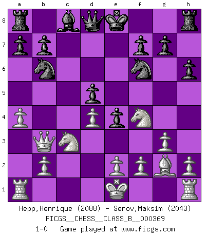 Last move : 1-0 2023 November 1 2:36:19 [Event "FICGS__CHESS__CLASS_B__000369"] [Site "FICGS"] [Date "2023.07.19"] [Round "1"] [White "Hepp,Henrique"] [Black "Serov,Maksim"] [Result "1-0"] [WhiteElo "2088"] [BlackElo "2043"] 1.c4 e5 2.g3 Nf6 3.Bg2 c6 4.d4 e4 5.Nc3 d5 6.Bg5 Nbd7 7.cxd5 cxd5 8.Qb3 Bd6 9.Nh3 h6 10.Bf4 Bxf4 11.Nxf4 Nb6 12.a4 1-0 This chess game has been lost on time (started : 2023.07.19 15:35:17) Follow this game move after move (download)At this time Fischer is simply a level above all the best Chessplayers in the world. (John Jacobs) Gott hat gewollt, dass ich Champion werde. (Surab Azmajparaschvili) Los Peones son nacidos libres, y aún así, se encuentran encadenados por todos lados. (Rick Kennedy) Il s'avisa de me proposer d'apprendre les échecs qu'il jouait un peu... me voilà forcené des échecs. J'achète un échiquier, je m'enferme dans ma chambre, j'y passe des jours et des nuits à vouloir apprendre par cur toutes les parties. (Jean-Jacques Rousseau, Confessions) I fear not the man who has practiced 10,000 kicks once, but I fear the man who has practiced one kick 10,000 times. (Bruce Lee)