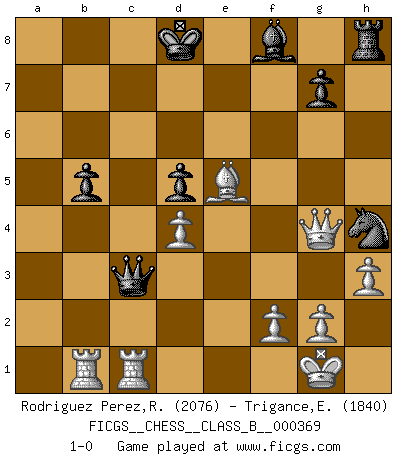 Last move : 1-0 2024 January 6 9:45:38 [Event "FICGS__CHESS__CLASS_B__000369"] [Site "FICGS"] [Date "2023.07.19"] [Round "1"] [White "Rodriguez Perez,Rene"] [Black "Trigance,Emile"] [Result "1-0"] [WhiteElo "2076"] [BlackElo "1840"] 1.e4 c6 2.d4 d5 3.e5 Bf5 4.Nf3 e6 5.Be2 Ne7 6.O-O Nd7 7.c3 Bg6 8.Nh4 Nf5 9.Nxg6 hxg6 10.Nd2 f6 11.Nf3 Qc7 12.Bf4 O-O-O 13.h3 g5 14.Bh2 Qb6 15.a4 a5 16.b4 fxe5 17.Nxg5 Re8 18.Bh5 Re7 19.Nf7 Rg8 20.Bg6 Rxf7 21.Bxf7 Rh8 22.Bxe6 Nh4 23.Bxd7+ Kxd7 24.bxa5 Qxa5 25.Bxe5 Qxc3 26.Rb1 b5 27.Qg4+ Kd8 28.axb5 cxb5 29.Rfc1 1-0 Follow this game move after move (download)Capture of the adverse King is the ultimate but not the first object of the game. (William Steinitz) Schach ist ein schwarz-weisser Dschungel. (Garry Kasparov) Yo he agregado estos principios a la ley: pongan los Caballos en acción antes de que los dos Alfiles sean desarrollados. (Emanuel Lasker) Les Echecs sont affaire de jugement sensible. Savoir quand frapper et quand esquiver. (Fischer) Drag your thoughts away from your troubles... by the ears, by the heels, or any other way you can manage it. (Mark Twain)