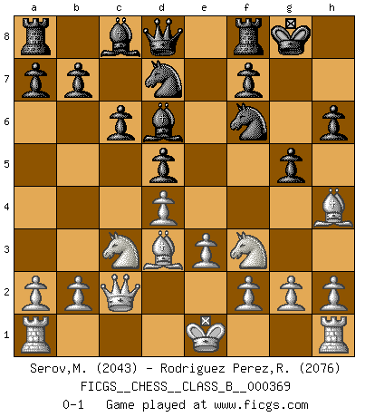 Last move : 0-1 2023 October 29 17:43:43 [Event "FICGS__CHESS__CLASS_B__000369"] [Site "FICGS"] [Date "2023.07.19"] [Round "1"] [White "Serov,Maksim"] [Black "Rodriguez Perez,Rene"] [Result "0-1"] [WhiteElo "2043"] [BlackElo "2076"] 1.d4 d5 2.c4 e6 3.Nc3 Nf6 4.cxd5 exd5 5.Bg5 Nbd7 6.e3 c6 7.Bd3 Bd6 8.Nf3 O-O 9.Qc2 h6 10.Bh4 g5 0-1 This chess game has been lost on time (started : 2023.07.19 15:35:17) Follow this game move after move (download)A big shock; the best chess player in history has passed away. (Lajos Portisch, about Bobby Fischer's death) Ich moechte nie einem Club beitreten, der Leute wie mich als Mitglieder aufnimmt. (Woody Allen) Preferería tener un Peón que un dedo. (Reuben Fine) Toutes les manuvres exécutées sur une colonne ouverte ont pour but ultime l'intrusion définitive sur la septième ou la huitième rangée, en plein cur de la position ennemie. (Aaron Nimzovitch) The Movers & Shakers of this world are those who play chess in the mornings and go to the disco in the evenings. (Dinesh De Silva)
