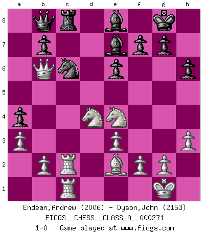 Last move : 1-0 2023 October 18 18:1:51 [Event "FICGS__CHESS__CLASS_A__000271"] [Site "FICGS"] [Date "2023.07.21"] [Round "1"] [White "Endean,Andrew"] [Black "Dyson,John"] [Result "1-0"] [WhiteElo "2006"] [BlackElo "2153"] 1.d4 Nf6 2.c4 e6 3.Nf3 d5 4.Nc3 Bb4 5.Bg5 h6 6.Bxf6 Qxf6 7.e3 O-O 8.Rc1 dxc4 9.Bxc4 c5 10.O-O cxd4 11.Nxd4 Bd7 12.Ne4 Qe5 13.Be2 Rd8 14.Qb3 a5 15.Nc3 Nc6 16.Nf3 Qc7 17.a3 Bf8 18.Rfd1 Rac8 19.Rc2 Na7 20.Rdc1 Qb8 21.Qb6 a4 22.h3 Be8 23.Ne4 Be7 24.Nd4 Nc6 25.Nf3 Na7 26.Nd4 Nc6 27.Nf3 Rd4 28.Nxd4 1-0 Follow this game move after move (download)In Fischer's hands, a slight theoretical advantage is as good a being a Queen ahead. (Isaac Kashdan) Irgendwie scheint mir sonntags früh um 9 Uhr der Killerinstinkt verloren gegangen zu sein. (Alexej Shirov) Cada Peón es una Reina en potencia. (James Mason) Même si l'adversaire joue le coup analysé précédemment, recommencez l'analyse en voyant la nouvelle position. Première règle de Blumenfeld All maxims have their antagonist maxims; proverbs should be sold in pairs, a single one being but a half truth. (William Mathews)