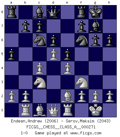 Last move : 1-0 2023 September 21 1:58:40 [Event "FICGS__CHESS__CLASS_A__000271"] [Site "FICGS"] [Date "2023.07.21"] [Round "1"] [White "Endean,Andrew"] [Black "Serov,Maksim"] [Result "1-0"] [WhiteElo "2006"] [BlackElo "2043"] 1.d4 Nf6 2.c4 g6 3.Nc3 Bg7 4.e4 d6 5.Nf3 O-O 6.Be2 e5 7.O-O h6 8.Rb1 a5 9.Re1 Nc6 10.d5 1-0 This chess game has been lost on time (started : 2023.07.21 9:18:32) Follow this game move after move (download)When the Chess game is over, the Pawn and the King go back to the same box. (Irish saying) Je mehr wir mit Computern analysieren, desto mehr glauben wir an Verteidigung. (Vladimir Kramnik) El Rey es una pieza de pelea. ¡Usenlo!. (Wilhelm Steinitz) Les Echecs ne sont pas pour les âmes timides. Ils requièrent un homme entier, qui ne s'arrête pas aveuglément à ce qui a été déjà établi, mais qui tente individuellement de sonder les profondeurs du jeu. (W. Steinitz) I don't believe in psychology. I believe in good moves. (Bobby Fischer)