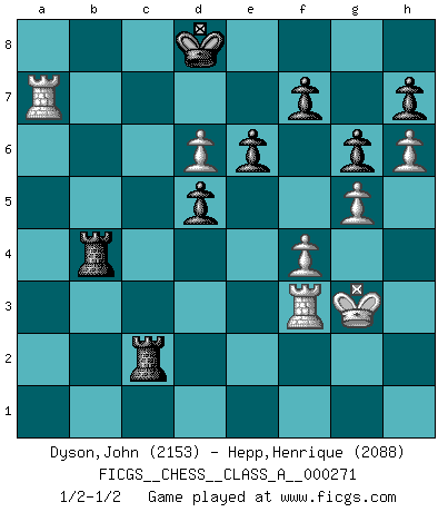 Last move : 1/2-1/2 2024 April 26 21:49:46 [Event "FICGS__CHESS__CLASS_A__000271"] [Site "FICGS"] [Date "2023.07.21"] [Round "1"] [White "Dyson,John"] [Black "Hepp,Henrique"] [Result "1/2-1/2"] [WhiteElo "2153"] [BlackElo "2088"] 1.e4 c5 2.Nc3 d6 3.Nge2 Nf6 4.d4 cxd4 5.Nxd4 a6 6.Be3 e6 7.Be2 Be7 8.f4 O-O 9.g4 d5 10.e5 Nfd7 11.g5 Nc6 12.h4 Qc7 13.h5 Bb4 14.h6 g6 15.O-O Bc5 16.Rf2 b5 17.Qd2 Qb6 18.Rd1 Bb7 19.a3 Rfc8 20.Kh2 Kf8 21.Bf1 Ke8 22.Rf3 Nxd4 23.Bxd4 Bc6 24.Ne2 Bxd4 25.Qxd4 a5 26.b4 Qc7 27.Re1 Kd8 28.Kg3 axb4 29.axb4 Qa7 30.Qxa7 Rxa7 31.Nd4 Nb6 32.R1e3 Bd7 33.Bxb5 Nc4 34.Rc3 Bxb5 35.Nxb5 Ra4 36.Nd6 Nxd6 37.exd6 Rxb4 38.Ra3 Rxc2 39.Ra7 1/2-1/2 Follow this game move after move (download)The stomach is an essential part of the Chess master. (Bent Larsen) Deine Wertungszahl - vorausgesetzt einige Jahre schachliche Anstrengung - entspricht etwa dem zehnfachen Deines IQ plus 1000. (Jonathan Levitt) El Ajedrez es tan interesante por sí solo, que no es necesario un interés monetario para persuadir a una persona a que lo practique; por lo tanto, nunca se juega por dinero. (Benjamin Franklin) C'est une question de caractère, Beaucoup de gens perdent leur motivation très vite. D'autres, ils sont rares, peuvent la conserver très longtemps. J'aime les échecs, encore aujourd'hui je suis heureux d'analyser des parties. J'aime toujours gagner, je déteste encore perdre. Bien jouer est important pour mon intégrité intellectuelle et morale. Et puis les échecs vivent en ce moment une période historique grâce à Internet. Ils se développent dans les systèmes éducatifs à travers le monde. Ils sortent de leur ghetto, et c'est mon rôle de mener à bien cette révolution. (Gary Kasparov) Perception is reality. (Immanuel Kant)