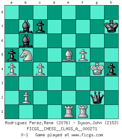 Last move : 0-1 2023 October 28 10:34:37 [Event "FICGS__CHESS__CLASS_A__000271"] [Site "FICGS"] [Date "2023.07.21"] [Round "1"] [White "Rodriguez Perez,Rene"] [Black "Dyson,John"] [Result "0-1"] [WhiteElo "2076"] [BlackElo "2153"] 1.e4 e5 2.Nf3 Nc6 3.Bc4 Bc5 4.O-O Nf6 5.d3 d6 6.c3 a5 7.Bg5 Ba7 8.Na3 h6 9.Bh4 g5 10.Bg3 Bg4 11.Bb3 h5 12.h4 Nd7 13.Bxf7+ Kxf7 14.Qb3+ Kg7 15.Nxg5 Qf6 16.Qxb7 Ne7 17.Qb3 Nc5 18.Qc2 Ne6 19.d4 Nxg5 20.hxg5 Qg6 21.f3 Bc8 22.Qd2 h4 23.Bh2 Rh5 24.Nb5 Bb6 25.Kh1 Ba6 26.a4 Rxg5 27.Rae1 Rg8 28.dxe5 dxe5 29.f4 Rg4 30.f5 Qf6 31.c4 Kh7 32.Qe2 Qh6 33.Bxe5 Rxg2 34.Qxg2 Rxg2 35.Kxg2 Nxf5 36.exf5 Qd2+ 37.Kf3 Bb7+ 38.Kg4 Qg2+ 0-1 Follow this game move after move (download)Fischer is an American Chess tragedy on par with Morphy and Pillsbury. (Mig Greengard) Woher wissen wir, daß der Neanderthaler Blindschach gespielt hat? -- Bei Ausgrabungen wurden keine Schachbretter und Figuren gefunden. (Anonymous) No es una movida, aún la mejor movida que tu debas buscar, sino un plan comprensible. (Eugene Znosko-Borovsky) Shah mat. Le roi est mort. Cri de fierté d'un joueur venant de terrasser son adversaire, courtoisement, sans effusion de sang. A journey of a thousand sites begins with a single click. (Author unknown)