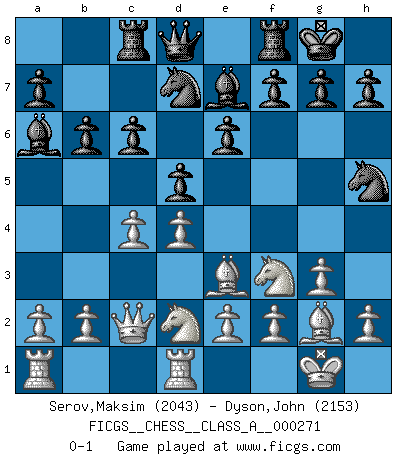 Last move : 0-1 2023 October 20 12:29:41 [Event "FICGS__CHESS__CLASS_A__000271"] [Site "FICGS"] [Date "2023.07.21"] [Round "1"] [White "Serov,Maksim"] [Black "Dyson,John"] [Result "0-1"] [WhiteElo "2043"] [BlackElo "2153"] 1.d4 Nf6 2.c4 e6 3.Nf3 d5 4.g3 Bb4+ 5.Bd2 Be7 6.Bg2 c6 7.O-O O-O 8.Qc2 Nbd7 9.Bf4 b6 10.Rd1 Ba6 11.Nbd2 Nh5 12.Be3 Rc8 0-1 This chess game has been lost on time (started : 2023.07.21 9:18:32) Follow this game move after move (download)What is the difference between chess and football? Everybody understands football, but nobody plays it. Everybody plays chess, but nobody understands it. Everything is relative. (Vladimir Kramnik) Wenn Capablanka heute auf der Schachbühne erscheinen würde, hätte er ein halbes Jahr gebraucht um sich die Schachtheorie anzueignen. Und dann hätte er alles und jeden besiegt. (Mikhail Moiseyevich Botvinik) Hay dos clases de hombres: aquellos que se conforman en dejarse llevar por las circunstancias y que juegan barajas y aquellos decididos a controlar las circunstancias y que juegan al Ajedrez. (Mortimer Collins) Roi des jeux et jeu des rois, les échecs portent en eux un sentiment d'infini. Ils donnent à celui qui s'est efforcé d'en approfondir les arcanes l'impression de n'être pas à la mesure de l'homme; en fait, ils constituent un résumé de l'univers, un microcosme, et figurent cette grande échelle qui, dans les plans de la lumière descend jusqu'à la matière, qui des abîmes insondables remonte jusqu'en l'infini de Dieu. (Pyrame) I've never seen so many men wasted so badly. (Blondie in The Good, The Bad and The Ugly)
