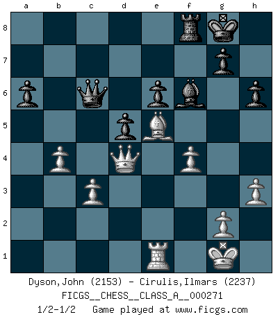 Last move : 1/2-1/2 2023 September 9 14:38:14 [Event "FICGS__CHESS__CLASS_A__000271"] [Site "FICGS"] [Date "2023.07.21"] [Round "1"] [White "Dyson,John"] [Black "Cirulis,Ilmars"] [Result "1/2-1/2"] [WhiteElo "2153"] [BlackElo "2237"] 1.e4 e6 2.d4 d5 3.Nc3 Nf6 4.e5 Nfd7 5.f4 c5 6.Nf3 Nc6 7.Be3 cxd4 8.Nxd4 Qb6 9.Qd2 Qxb2 10.Rb1 Qa3 11.Bb5 Nxd4 12.Bxd4 a6 13.Bxd7+ Bxd7 14.Rb3 Qe7 15.Rxb7 Rc8 16.O-O Qd8 17.Qf2 Rxc3 18.Bxc3 Qc8 19.Rb3 Ba4 20.Bd4 Bxb3 21.axb3 Be7 22.c3 O-O 23.b4 f6 24.Re1 fxe5 25.Bxe5 Bf6 26.Qd4 h6 27.h3 Qc6 1/2-1/2 Follow this game move after move (download)Human affairs are like a Chess game: only those who do not take it seriously can be called good players. (Hung Tzu Ch'eng) Die größte Kunst beim Schach besteht darin dem Gegner nicht zu zeigen was er tun kann. (Garry Kasparov) No nos podemos resistir a la fascinación de un sacrificio ya que la pasión por los sacrificios es parte de la naturaleza de un jugador de Ajedrez. (Rudolf Spielman) Vous n'êtes pas toujours obligé de jouer le meilleur coup. Un coup doit être actif, entreprenant, correct et beau ! (David Bronstein) If everyone is thinking alike, then somebody isn't thinking. (US General George S. Patton)