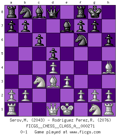 Last move : 0-1 2023 September 18 23:48:1 [Event "FICGS__CHESS__CLASS_A__000271"] [Site "FICGS"] [Date "2023.07.21"] [Round "1"] [White "Serov,Maksim"] [Black "Rodriguez Perez,Rene"] [Result "0-1"] [WhiteElo "2043"] [BlackElo "2076"] 1.d4 d5 2.c4 e6 3.Nc3 Nf6 4.cxd5 exd5 5.Bg5 Be7 6.e3 h6 7.Bh4 O-O 8.Bd3 c6 0-1 This chess game has been lost on time (started : 2023.07.21 9:18:32) Follow this game move after move (download)We cannot resist the fascination of sacrifice, since a passion for sacrifices is part of a Chessplayer's nature. (Rudolf Spielman) Im Blitz ist es einfacher mit einer Figur weniger anzugreifen, als sich mit einer Mehrfigur zu verteidigen. (Mikhail Nekhemyevich Tal) Un jugador que trata de regresar una movida en el Ajedrez es un futuro carterista. (Richard Fenton) Le pion, dans sa simplicité, marche droit devant lui, mais lorsqu'il prend, il le fait obliquement? Ainsi l'homme, tant qu'il reste pauvre, marche dans la droiture et vit honnêtement, mais lorsqu'il recherche les honneurs, il flatte, se parjure et, par les voies obliques, cherche une position supérieure sur l'échiquier du monde. (Jean de Galles) We're missing something. (Gregory House, House M.D.)
