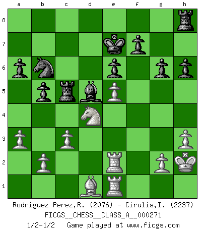 Last move : 1/2-1/2 2023 November 9 22:16:32 [Event "FICGS__CHESS__CLASS_A__000271"] [Site "FICGS"] [Date "2023.07.21"] [Round "1"] [White "Rodriguez Perez,Rene"] [Black "Cirulis,Ilmars"] [Result "1/2-1/2"] [WhiteElo "2076"] [BlackElo "2237"] 1.e4 e6 2.d4 d5 3.Bd3 dxe4 4.Bxe4 Nf6 5.Bf3 Be7 6.Nc3 c5 7.dxc5 Qxd1+ 8.Bxd1 Bxc5 9.Nf3 Nc6 10.O-O Bd7 11.h3 O-O 12.Be3 Bxe3 13.fxe3 Rfc8 14.Be2 Kf8 15.Rad1 Be8 16.Bd3 Rab8 17.Rf2 h6 18.a3 Ke7 19.Nb5 a6 20.Nbd4 b5 21.e4 Nxd4 22.Nxd4 Nd7 23.c3 g6 24.Nf3 Rb7 25.e5 Nc5 26.Nd4 Rd7 27.Rfd2 Rd5 28.Re1 Bc6 29.Bc2 Ba8 30.Rde2 Nd7 31.Kh2 Rdc5 32.Nb3 Rd5 33.Nd4 Rb8 34.Nb3 Nb6 35.Bd1 Rbd8 36.Bc2 Nc4 37.Nd4 Rc5 38.Bb3 Nb6 39.Bd1 Bd5 40.Re3 Nc4 41.R3e2 Nb6 42.Re3 Rdc8 43.R3e2 Rh8 1/2-1/2 Follow this game move after move (download)Bobby Fischer is the greatest Chess genius of all time ! (Alexander Kotov) Schach ist die gewalttätigste aller Sportarten. (Garry Kasparov) Debes de llevar a tu oponente hacia un profundo y obscuro bosque donde 2+2=5, y el camino que conduce a la salida es suficientemente ancho para solamente uno. (Mikhail Tal) Ce qui caractérise les parties de combat, c'est que si le défenseur a constamment de difficiles problèmes à résoudre, l'attaquant doit chercher sans relâche de nouvelles possibilités d'attaque. (Koblentz) Lottery : A tax on people who are bad at math. (Author unknown)