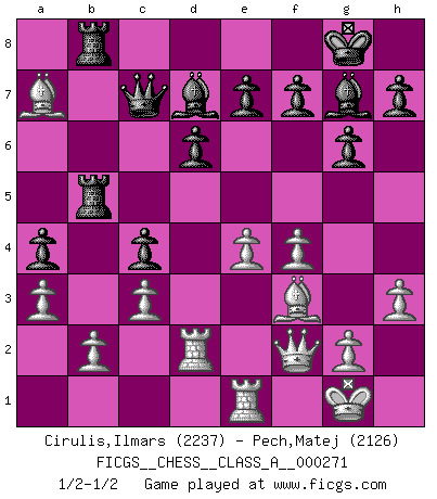 Last move : 1/2-1/2 2023 November 7 6:33:39 [Event "FICGS__CHESS__CLASS_A__000271"] [Site "FICGS"] [Date "2023.07.21"] [Round "1"] [White "Cirulis,Ilmars"] [Black "Pech,Matej"] [Result "1/2-1/2"] [WhiteElo "2237"] [BlackElo "2126"] 1.e4 c5 2.d4 cxd4 3.Nf3 d6 4.c3 Nf6 5.Qxd4 Nc6 6.Qd3 g6 7.Be2 Bg7 8.O-O O-O 9.h3 a6 10.Bf4 b5 11.Nbd2 Nd7 12.Rfc1 Nce5 13.Nxe5 Nxe5 14.Qg3 Be6 15.Be3 Nc4 16.Nxc4 bxc4 17.f4 Qc7 18.Bf3 a5 19.Qf2 Rab8 20.Rc2 Bd7 21.Re1 a4 22.a3 Rb5 23.Rd2 Rfb8 24.Ba7 1/2-1/2 Follow this game move after move (download)In order to improve your game, you must study the endgame before everything else, for whereas the endings can be studied and mastered by themselves, the middle game and the opening must be studied in relation to the endgame. (Jose Raul Capablanca) Über Frauen: Chess is better. (Robert James Fischer) Los problemas de Ajedrez exigen del compositor las mismas virtudes que caracterizan todo el arte de valor: originalidad, invención, concisión, armonía, complejidad e insinceridad explendida. (Vladimir Nabokov) Il (Jacob Murray) ne joue pas pour le bon coup, mais pour le meilleur. (Eloi Relange) No, I am still playing. (Anatoly Karpov)