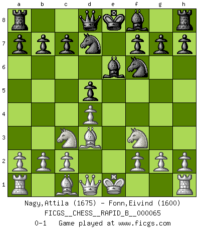 Last move : 0-1 2007 October 17 12:58:42 [Event "FICGS__CHESS__RAPID_B__000065"] [Site "FICGS"] [Date "2007.09.04"] [Round "1"] [White "Nagy,Attila"] [Black "Fonn,Eivind"] [Result "0-1"] [WhiteElo "1675"] [BlackElo "1600"] 1.e4 e6 2.Nc3 d5 3.exd5 exd5 4.d4 Nf6 5.Bd3 Be6 6.Nf3 Nbd7 0-1 This chess game has been lost on time (started : 2007.09.04 5:4:18) French defense Player Black won this chess game. Follow this game move after move (download)The winner of the game is the player who makes the next-to-last mistake. (Savielly Tartakover) Verschiedene, sehr schätzbare und im Laufe des Lebens nützliche Eigenschaften des Geistes können durch das Schachspiel erworben und gekräftigt werden, so dass sie zu Gewohnheiten werden, die uns nie im Stich lassen. (Benjamin Franklin) Algunos sacrificios son sólidos, los demás son míos. (Mikhail Tal) Les Cavaliers se révèlent fort utiles dans les positions fermées. D'habitude, les Fous sont un peu plus forts que les Cavaliers dans les positions ouvertes. Qu'on le veuille ou non, il restera toujours des exceptions ! Crush them ! Make them suffer ! (General Grievous in Star Wars ep.3)