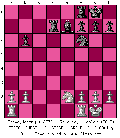 Last move : 0-1 2006 July 10 12:33:7 [Event "FICGS__CHESS__WCH_STAGE_1_GROUP_02__000001 "] [Site "FICGS"] [Date "2006.07.01"] [Round "1"] [White "Frame,Jeremy"] [Black "Rakovic,Miroslav"] [Result "0-1"] [WhiteElo "1277"] [BlackElo "2045"] 1.e4 e6 2.d4 d5 3.exd5 exd5 4.Nf3 Nf6 5.c4 Be7 6.Be2 O-O 7.O-O dxc4 8.Bxc4 Bg4 9.Be3 Nc6 10.Nc3 Qd7 11.Be2 Rad8 12.Ne5 Bxe2 13.Qxe2 Nxd4 14.Nxd7 Nxe2+ 15.Nxe2 Rxd7 16.Bxa7 b6 17.Bxb6 cxb6 0-1 French : Exchange variation Kingside Castling by player Black (move 6) Kingside Castling by player White (move 7) Player Black won this chess game. Follow this game move after move (download)Chess is like war on a board. (Bobby Fischer) Ich kämpfe solange mein Gegner einen Fehler machen kann. (Emanuel Lasker) El Ajedrez es realmente noventa y nueve por ciento calculación. (Soltis) Des combinaisons [dans le jeu d'échecs] pareilles à des mélodies. Je crois entendre pour ainsi dire la musique des coups... (Vladimir Nabokov) Employ the attack like tactic of defense. (Chinese proverb)