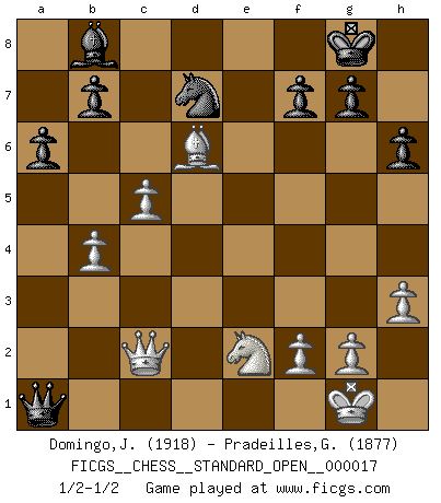Last move : 1/2-1/2 2023 December 20 21:54:45 [Event "FICGS__CHESS__STANDARD_OPEN__000017"] [Site "FICGS"] [Date "2023.07.24"] [Round "1"] [White "Domingo,Jordi"] [Black "Pradeilles,Guillaume"] [Result "1/2-1/2"] [WhiteElo "1918"] [BlackElo "1877"] 1.e4 e5 2.Nf3 Nc6 3.Bc4 Bc5 4.c3 Nf6 5.d3 a6 6.O-O Ba7 7.Nbd2 d6 8.Bb3 O-O 9.h3 Re8 10.Re1 Be6 11.Nf1 Bxb3 12.Qxb3 Rb8 13.Ng3 h6 14.Nf5 d5 15.Qc2 Ne7 16.Nxe5 dxe4 17.dxe4 Nxf5 18.exf5 Nd5 19.Bd2 Qh4 20.Nd3 Rbd8 21.Rxe8+ Rxe8 22.c4 Nf6 23.c5 Qe4 24.Re1 Qxf5 25.Rxe8+ Nxe8 26.Qc4 Nf6 27.Bf4 Qd5 28.Qc2 Qxa2 29.Bxc7 Nd7 30.Bd6 Qd5 31.b4 Bb8 32.Nf4 Qd4 33.Ne2 Qa1+ 1/2-1/2 Follow this game move after move (download)A man that will take back a move at Chess will pick a pocket. (Richard Fenton) Heutzutage gewinnt im Turnier nicht derjenige Spieler, der weitreichende Pläne entwirft, sondern einfach jener, der Zug um Zug kämpft. (David Bronstein) Fischer es una tragedia del Ajedrez Americano a la par con Morphy y Pillsbury. (Mig Greengard) Echiquier : carré parfait, comme la Jérusalem nouvelle décrite par l'auteur de l'Apocalypse, huit cases sur huit, exaltation du chiffre 4, symbole du cosmos aux quatre horizons... où le noir et le blanc, l'ombre et la lumière, le mal et le bien s'entremêlent et se conjuguent. (Robert Couffignal, Le Gambit du poète) If things go wrong, don't go with them. (Roger Babson)