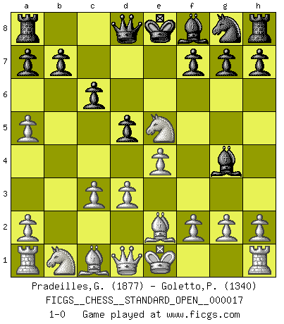Last move : 1-0 2023 September 9 14:37:21 [Event "FICGS__CHESS__STANDARD_OPEN__000017"] [Site "FICGS"] [Date "2023.07.24"] [Round "2"] [White "Pradeilles,Guillaume"] [Black "Goletto,Piero Giuseppe"] [Result "1-0"] [WhiteElo "1877"] [BlackElo "1340"] 1.e4 e5 2.Nf3 Nc6 3.Bb5 Na5 4.c3 c6 5.Be2 d5 6.d3 Bg4 7.b4 Qe7 8.bxa5 Qd8 9.Nxe5 1-0 This chess game has been lost on time (started : 2023.07.24 22:15:38) Follow this game move after move (download)The blunders are all there on the board, waiting to be made. (Savielly Tartakover) Es hat in meinem Leben Zeiten gegeben, in denen das Schachspiel, wenn nicht zum Lebenszweck, so doch zu einem regelrechten Lebensersatz geworden ist. Man fühlt sich in solchen Zeiten nicht so, als besäße man eine göttliche Gabe, sondern eher so, als sei man von ihr besessen. (Garry Kasparov) Una compensación adecuada por un sacrificio es tener una combinación sólida que conduce a una posición ganadora; una compensación adecuada por una metida de pata es dejar a tu oponente arrebatar una derrota de las fauces de la victoria. (Bruce A. Moon) La tactique est l'élément le plus important du milieu de jeu. (Siegbert Tarrasch) A bird doesn't sing because it has an answer, it sings because it has a song. (Maya Angelou)