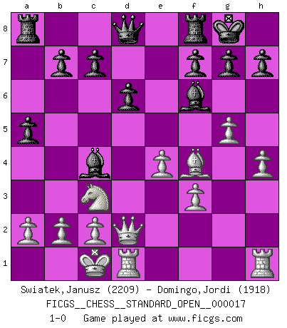 Last move : 1-0 2023 November 18 6:17:54 [Event "FICGS__CHESS__STANDARD_OPEN__000017"] [Site "FICGS"] [Date "2023.07.24"] [Round "1"] [White "Swiatek,Janusz"] [Black "Domingo,Jordi"] [Result "1-0"] [WhiteElo "2209"] [BlackElo "1918"] 1.e4 e5 2.Nf3 d6 3.d4 exd4 4.Nxd4 Nf6 5.Nc3 Be7 6.Bf4 O-O 7.Qd2 Nc6 8.O-O-O Nxd4 9.Qxd4 Be6 10.f3 Nd7 11.h4 Bf6 12.Qd2 Ne5 13.Be2 Nc4 14.Bxc4 Bxc4 15.g4 a5 16.g5 1-0 This chess game has been lost on time (started : 2023.07.24 22:15:38) Follow this game move after move (download)Nowadays, when you're not a grandmaster at 14, you can forget about it. (Anand Viswanathan) Ich verlor meine Bürgerrechte, mein Gehalt wurde mir nicht mehr bezahlt und ich wurde zensiert und durfte nicht mehr ins Ausland reisen. [nach dem Match Fischer-Taimanov 6:0] (Mark Taimanov) Evita las multitudes. Haz independientemente tu propio razonamiento. Trata de ser el jugador de Ajedrez, no la pieza de Ajedrez. (Ralph Charell) Celui qui prend des risques peut perdre, celui qui n'en prend pas perd toujours. (Xavier Tartacover) Whenever people agree with me, I always feel I must be wrong. (Oscar Wilde)