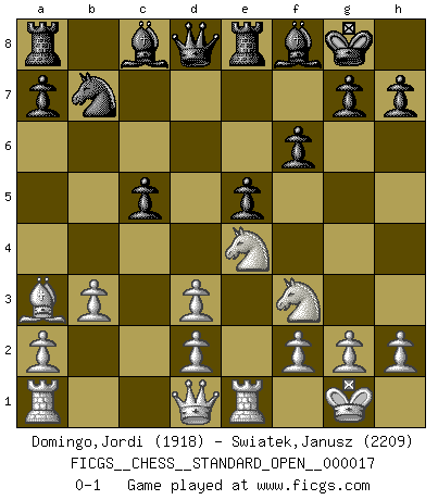 Last move : 0-1 2023 November 25 12:1:5 [Event "FICGS__CHESS__STANDARD_OPEN__000017"] [Site "FICGS"] [Date "2023.07.24"] [Round "2"] [White "Domingo,Jordi"] [Black "Swiatek,Janusz"] [Result "0-1"] [WhiteElo "1918"] [BlackElo "2209"] 1.e4 e5 2.Nf3 Nc6 3.Bc4 Nf6 4.Ng5 d5 5.exd5 Na5 6.Bb5+ c6 7.dxc6 bxc6 8.Bd3 Nd5 9.Nf3 Bd6 10.O-O Nf4 11.Re1 Nxd3 12.cxd3 O-O 13.b3 f6 14.Nc3 Re8 15.Bb2 c5 16.Ne4 Bf8 17.Ba3 Nb7 0-1 This chess game has been lost on time (started : 2023.07.24 22:15:38) Follow this game move after move (download)It is the aim of the modern school, not to treat every position according to one general law, but according to the principle inherent in the position. (Richard Reti) Im Leben werden Partien nie so unstrittig gewonnen wie im Spiel (Emanuel Lasker) A través de las casillas del tablero, los Indios explican el movimiento del tiempo y la edad, las influencias mas altas que controlan el mundo y los lazos que vinculan al Ajedrez con el alma humana. (Al-Masudi) La solitude du joueur d'Echecs à l'approche du mat est semblable à celle du condamné. (Francis Szpiner) Life is pain my dear and anyone who says otherwise is selling something. (Princess Bride)