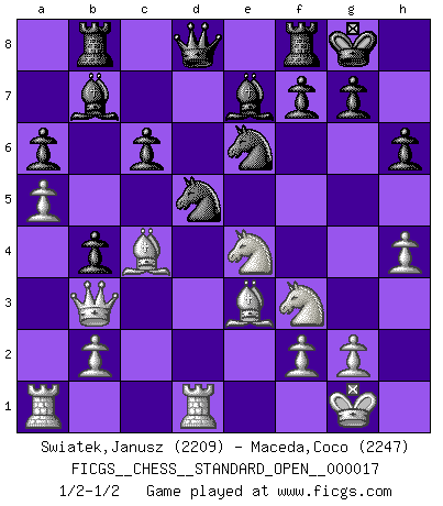 Last move : 1/2-1/2 2023 October 28 4:19:57 [Event "FICGS__CHESS__STANDARD_OPEN__000017"] [Site "FICGS"] [Date "2023.07.24"] [Round "2"] [White "Swiatek,Janusz"] [Black "Maceda,Coco"] [Result "1/2-1/2"] [WhiteElo "2209"] [BlackElo "2247"] 1.e4 e5 2.Nf3 Nc6 3.Bb5 a6 4.Ba4 Nf6 5.O-O Be7 6.Re1 b5 7.Bb3 O-O 8.a4 b4 9.a5 d6 10.c3 Rb8 11.Bc4 d5 12.exd5 Nxd5 13.h3 Bb7 14.d4 exd4 15.cxd4 Bf6 16.Nbd2 Nxd4 17.Ne4 Ne6 18.Qb3 Be7 19.h4 h6 20.Rd1 c6 21.Be3 1/2-1/2 Follow this game move after move (download)A bad plan is better than none at all. (Frank Marshall) Schach ist wie eine schöne Frau, zu der wir ständig zurückkehren, gleichviel, wie oft sie uns zurückweist. (Anonymous) Un juego de Ajedrez es un dialogo, una conversación entre un jugador y su oponente. Cada movimiento del oponente puede contener amenazas o tropiezos, pero un jugador no se puede defender de las amenazas o tomar ventaja de los tropiezos si es que no se pregunta a sí mismo: ¿Que es lo que mi oponente va a hacer después de cada movida?. (Bruce A. Moon) C'est la seule position que je connaisse où les deux camps sont mals. Propos prêtés à V. Anand. Do not put your faith in what statistics say until you have carefully considered what they do not say. (William W. Watt)