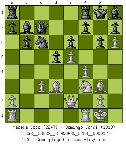 Last move : 1-0 2023 November 29 23:29:15 [Event "FICGS__CHESS__STANDARD_OPEN__000017"] [Site "FICGS"] [Date "2023.07.24"] [Round "2"] [White "Maceda,Coco"] [Black "Domingo,Jordi"] [Result "1-0"] [WhiteElo "2247"] [BlackElo "1918"] 1.d4 d5 2.Bf4 Nf6 3.e3 c5 4.Nf3 Nc6 5.Nbd2 e6 6.c3 Bd6 7.Bg3 O-O 8.Bd3 b6 9.e4 Be7 10.e5 Nh5 11.Ng5 Bxg5 12.Qxh5 g6 13.Qe2 cxd4 14.h4 Bh6 15.h5 dxc3 16.bxc3 Bg7 17.f4 Qc7 18.Nf3 Bb7 19.h6 Bh8 20.O-O 1-0 This chess game has been lost on time (started : 2023.07.24 22:15:38) Follow this game move after move (download)Do you realize Fischer almost never has any bad pieces? He exchanges them, and the bad pieces remain with his opponents. (Yuri Balashov) Ich habe die besten Aussichten, den ersten Preis zu gewinnen - denn jeder muss gegen Steinitz spielen, nur ich nicht! (Wilhelm Steinitz) No soy una persona materialista y por eso, no resiento la falta o pérdida del dinero. La ausencia de cosas mundanas carece de importancia. Ya que el Ajedrez es una forma en la que puedo ser tan materialista como yo desee sin tener la necesidad de vender mi alma. (Jamie Walter Adams) Vous savez, camarade Pachman, je n'éprouve pas de plaisir à être ministre, je jouerais plutôt aux échecs comme vous, ou alors ferais une révolution au Venezuela. (Che Guevara à Ludek Pachman, 'Checkmate in Prague', 1975) Internet: Absolute communication, absolute isolation. (Paul Carvel)