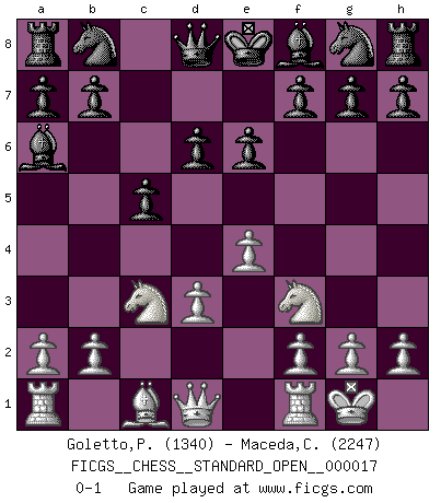 Last move : 0-1 2023 September 9 0:45:57 [Event "FICGS__CHESS__STANDARD_OPEN__000017"] [Site "FICGS"] [Date "2023.07.24"] [Round "2"] [White "Goletto,Piero Giuseppe"] [Black "Maceda,Coco"] [Result "0-1"] [WhiteElo "1340"] [BlackElo "2247"] 1.e4 c5 2.Nf3 d6 3.Bb5+ Bd7 4.O-O Bxb5 5.c4 Bxc4 6.d3 Ba6 7.Nc3 e6 0-1 This chess game has been lost on time (started : 2023.07.24 22:15:38) Follow this game move after move (download)A player surprised is half beaten. (Proverb) Obwohl ich vom Stil her kaum zu den Priestern der Schachkunst gezählt werde, halte ich Schach doch für eine Kunst. (Tigran Petrosjan) Botvinnik trataba de restarle el misterio al Ajedrez, siempre relacionandolo a situaciones de la vida ordinaria. El gustaba de llamar al Ajedrez un típico problema inexacto similar a aquellos de los cuales la gente siempre tiene que enfrentarse en la vida cotidiana. (Garry Kasparov) La menace est plus forte que l'exécution. (Aaron Nimzovitch) Those parts of the system that you can hit with a hammer (not advised) are called hardware; those program instructions that you can only curse at are called software. (Anonymous)