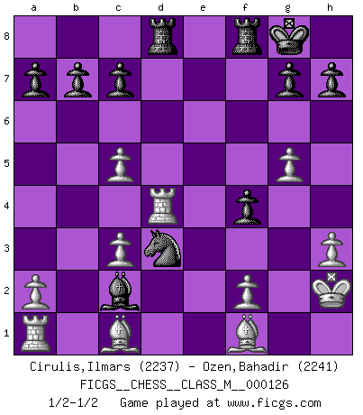 Last move : 1/2-1/2 2023 August 3 8:26:1 [Event "FICGS__CHESS__CLASS_M__000126"] [Site "FICGS"] [Date "2023.07.27"] [Round "1"] [White "Cirulis,Ilmars"] [Black "Ozen,Bahadir"] [Result "1/2-1/2"] [WhiteElo "2237"] [BlackElo "2241"] 1.e4 e5 2.Nc3 Nf6 3.g3 d5 4.exd5 Nxd5 5.Nf3 Nxc3 6.bxc3 Nc6 7.Bg2 Bc5 8.O-O O-O 9.Re1 Bg4 10.h3 Bh5 11.g4 Bg6 12.Nxe5 Nxe5 13.d4 f5 14.g5 f4 15.dxc5 Qxd1 16.Rxd1 Rae8 17.Kh2 Bxc2 18.Rd4 Nd3 19.Bf1 Rd8 1/2-1/2 Follow this game move after move (download)For surely of all the drugs in the world, Chess must be the most permanently pleasurable. (Assiac) Der Traum, für den ich lebe, ist der von einem freien Russland. Viele mögen sagen: Russland hat doch ein Parlament, einen gewählten Präsidenten. Aber ich spüre, dass in meiner Heimat die Angst wiederkehrt. Eine Angst, sich frei zu äußern, bestimmte Dinge zu tun (Garry Kasparov) Con el fin de mejorar tu juego, debes de estudiar los finales antes que todo, ya que mientras que los finales pueden ser estudiados y dominados por sí mismos, el juegomedio y la apertura deben de ser estudiados en relación con los finales. (José Raúl Capablanca) Les erreurs sont comme les malheurs, elles n'arrivent jamais seules. (Siegbert Tarrasch) Home computers are being called upon to perform many new functions, including the consumption of homework formerly eaten by the dog. (Doug Larson)