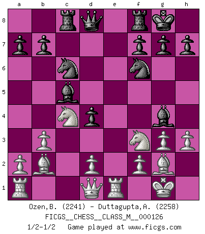 Last move : 1/2-1/2 2023 September 6 19:4:35 [Event "FICGS__CHESS__CLASS_M__000126"] [Site "FICGS"] [Date "2023.07.27"] [Round "1"] [White "Ozen,Bahadir"] [Black "Duttagupta,Aniruddha"] [Result "1/2-1/2"] [WhiteElo "2241"] [BlackElo "2258"] 1.Nf3 Nf6 2.b3 d5 3.Bb2 Bf5 4.Nh4 Bd7 5.g3 c5 6.Bg2 e6 7.c4 Nc6 8.cxd5 exd5 9.O-O d4 10.e3 Be7 11.Na3 O-O 12.Nf3 Bg4 13.exd4 cxd4 14.Nc4 Rc8 15.Re1 Bc5 16.h3 1/2-1/2 Follow this game move after move (download)The most powerful weapon in Chess is to have the next move. (David Bronstein) Ich bin es gewohnt, das die Jugend mir überhaupt keinen Respekt entgegenbringt. (Alexander Morozewich) Una compensación adecuada por un sacrificio es tener una combinación sólida que conduce a una posición ganadora; una compensación adecuada por una metida de pata es dejar a tu oponente arrebatar una derrota de las fauces de la victoria. (Bruce A. Moon) Echiquier : carré parfait, comme la Jérusalem nouvelle décrite par l'auteur de l'Apocalypse, huit cases sur huit, exaltation du chiffre 4, symbole du cosmos aux quatre horizons... où le noir et le blanc, l'ombre et la lumière, le mal et le bien s'entremêlent et se conjuguent. (Robert Couffignal, Le Gambit du poète) For peace of mind, resign as general manager of the universe. (Douglas Adams)