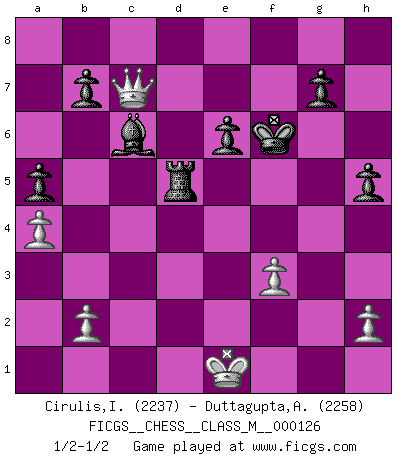 Last move : 1/2-1/2 2023 September 11 14:58:47 [Event "FICGS__CHESS__CLASS_M__000126"] [Site "FICGS"] [Date "2023.07.27"] [Round "1"] [White "Cirulis,Ilmars"] [Black "Duttagupta,Aniruddha"] [Result "1/2-1/2"] [WhiteElo "2237"] [BlackElo "2258"] 1.e4 c6 2.d4 d5 3.e5 Bf5 4.Nf3 e6 5.Be2 c5 6.Be3 cxd4 7.Nxd4 Ne7 8.c4 Nbc6 9.Qa4 a6 10.Nd2 Qd7 11.cxd5 Nxd4 12.Qxd4 exd5 13.Rd1 Nc6 14.Qf4 d4 15.Nc4 Bb4+ 16.Kf1 Bc2 17.Nb6 Qe7 18.Nd5 Qd8 19.Rxd4 Nxd4 20.Qxd4 Be7 21.Qc4 Rc8 22.Qg4 Bf8 23.Bg5 h5 24.Qh3 Ba4 25.Bxd8 Rc1+ 26.Bd1 Rxd1+ 27.Ke2 Rxd5 28.Ba5 Bd7 29.Qc3 Bb5+ 30.Ke1 Bc5 31.Bb4 Bxb4 32.Qxb4 Rh6 33.a4 a5 34.Qe4 Bc6 35.Qf5 Bd7 36.Qg5 Rc6 37.f3 Rg6 38.Qe3 Rxg2 39.e6 fxe6 40.Rg1 Rxg1+ 41.Qxg1 Kf7 42.Qb6 Bc6 43.Qc7+ Kf6 1/2-1/2 Follow this game move after move (download)If one piece is badly posted, the whole game is bad. (Tarrasch) Je mehr wir mit Computern analysieren, desto mehr glauben wir an Verteidigung. (Vladimir Kramnik) Las leyes del Ajedrez no permiten una libre elección: tienes que mover quieras o no. (Emanuel Lasker) Vouloir jouer aux échecs contre soi-même est aussi paradoxal que vouloir marcher sur son ombre. (Stefan Zweig) Indecision is the key to flexibility. (Unknown)